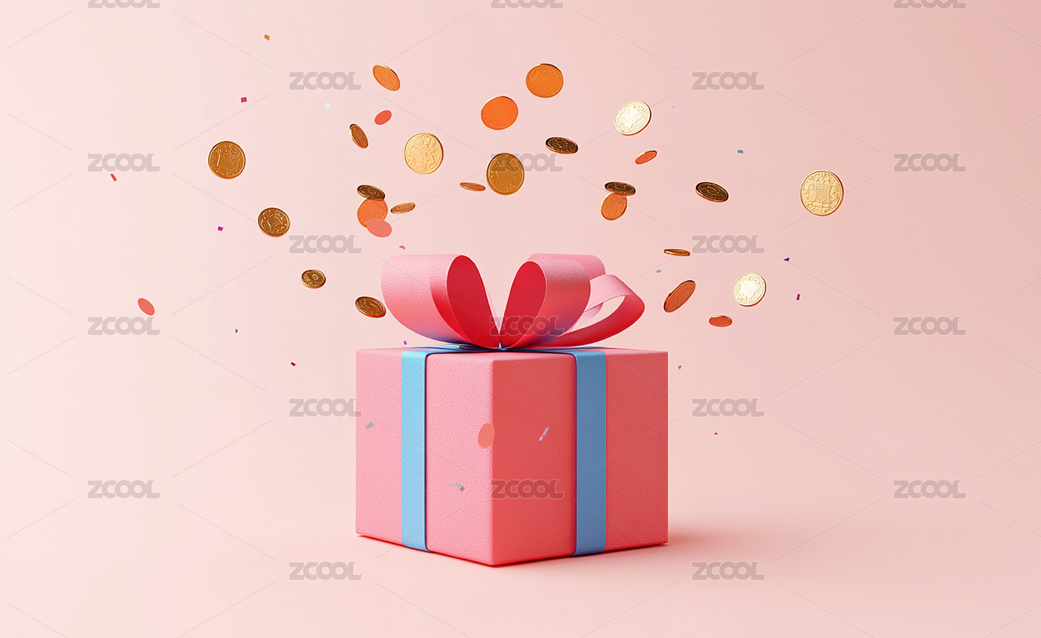 一个粉色礼品盒,周围飘散着各种彩带