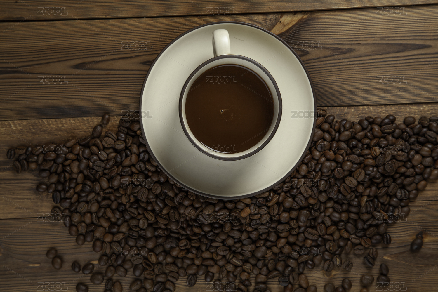 一杯咖啡和咖啡豆摆放在桌面上特写