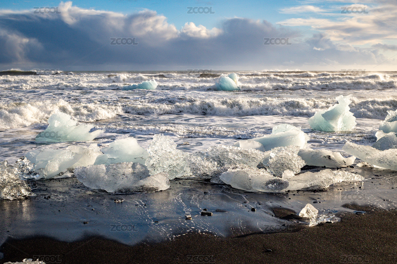北欧冰岛雷克雅未克的黑沙滩上的冰块