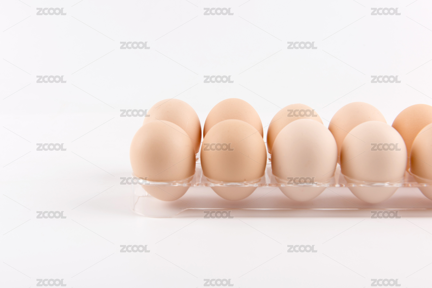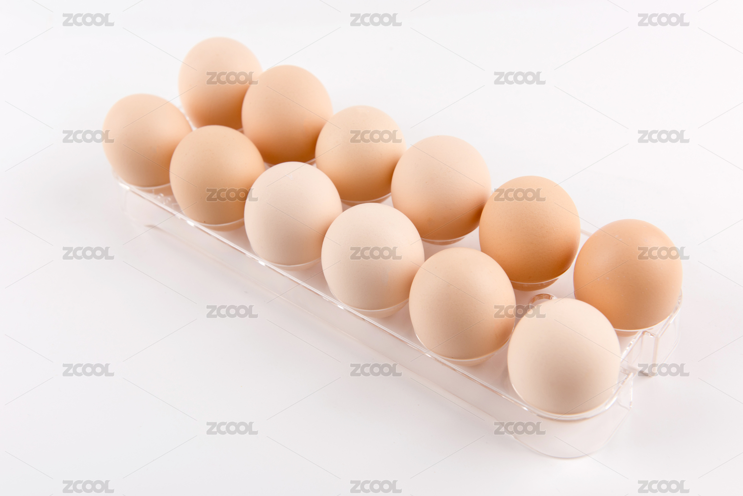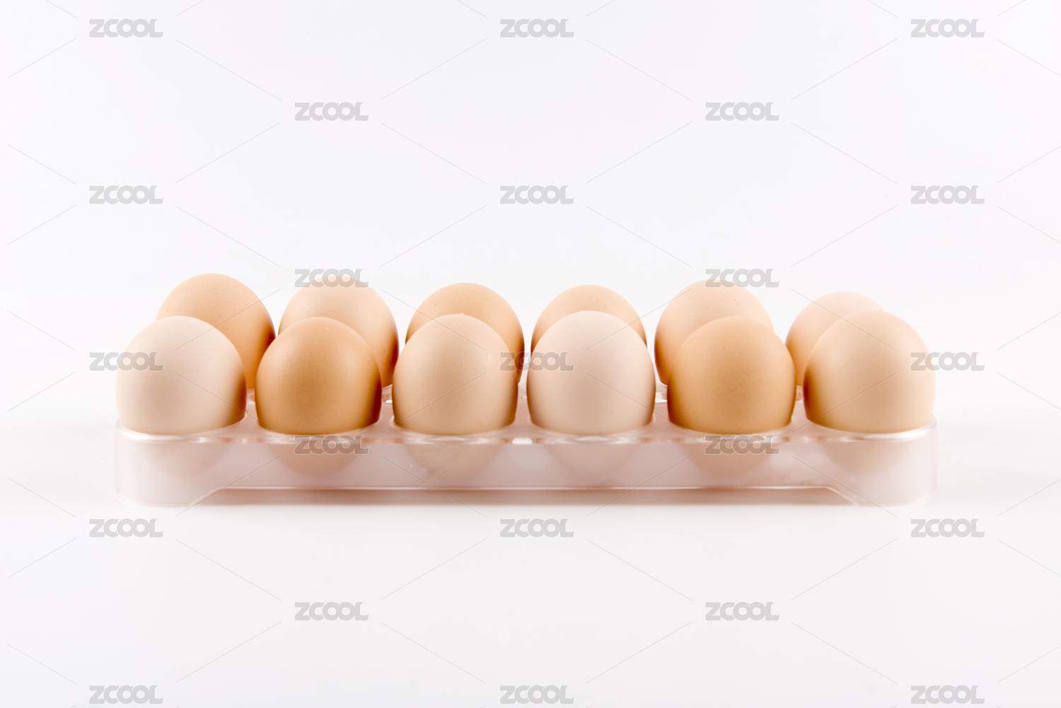 白色背景透明塑料盒中排列整齐的新鲜鸡蛋