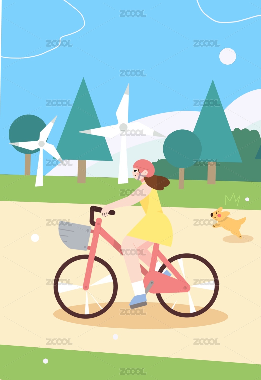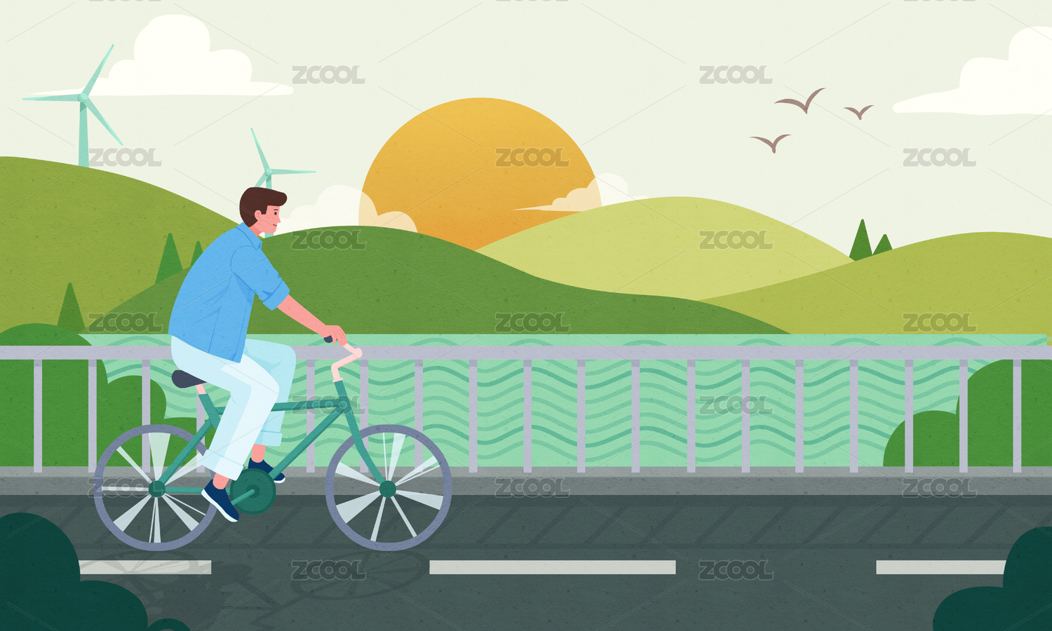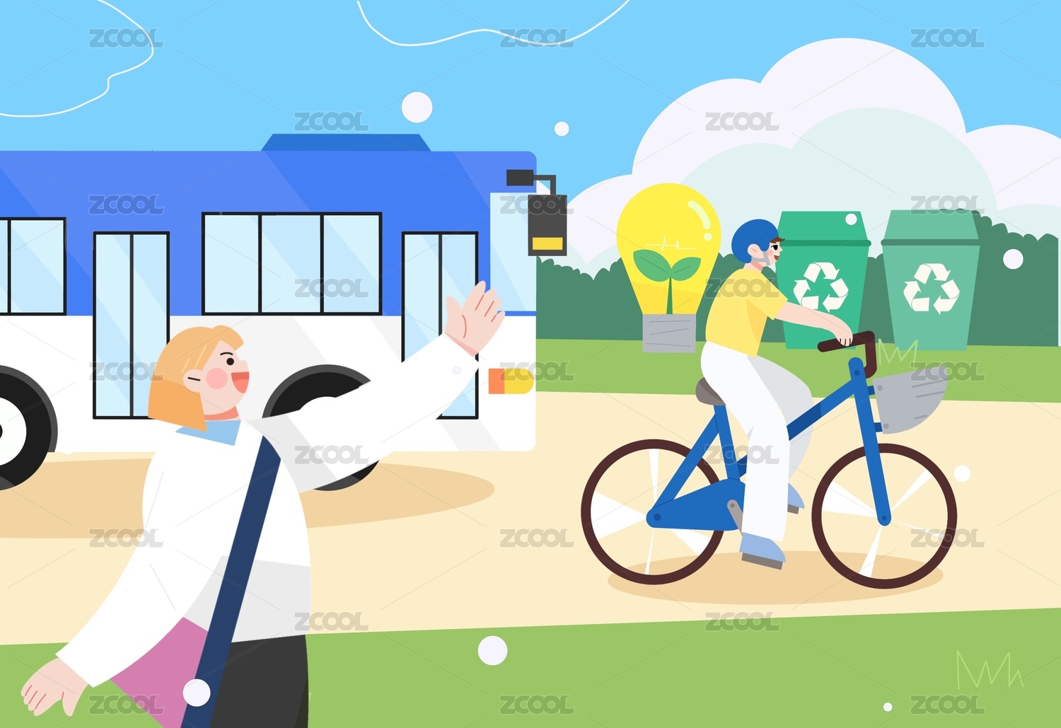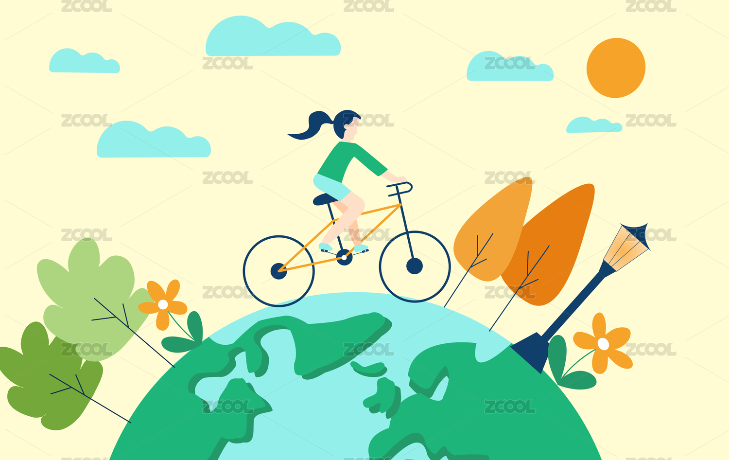 卡通环保低碳出行自行车交通出行方式垃圾分