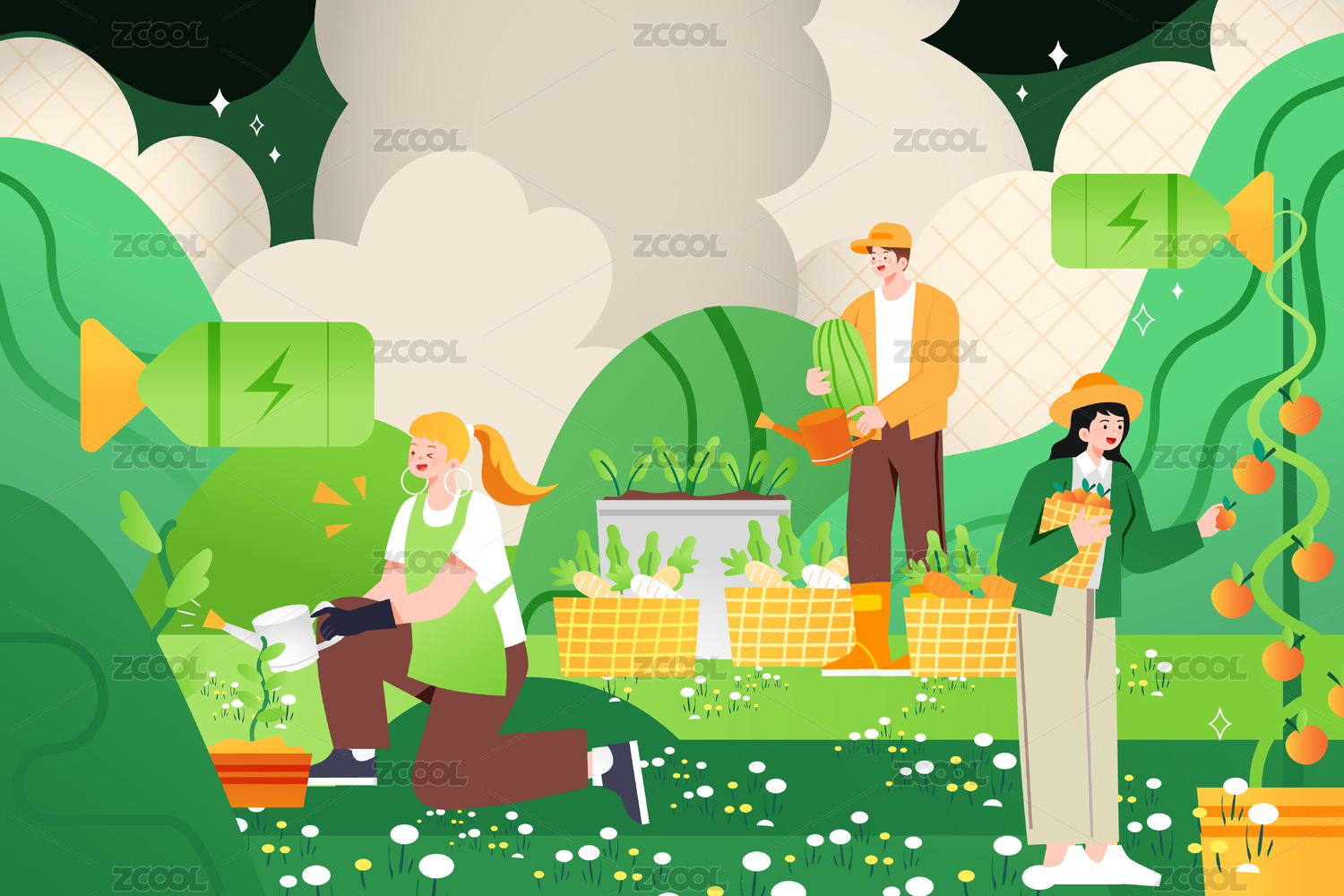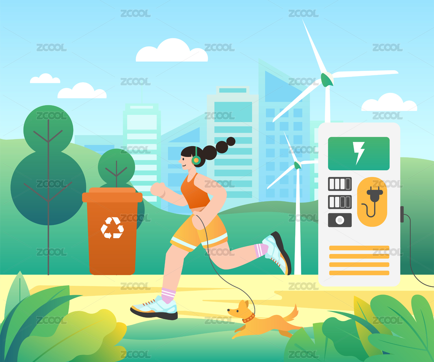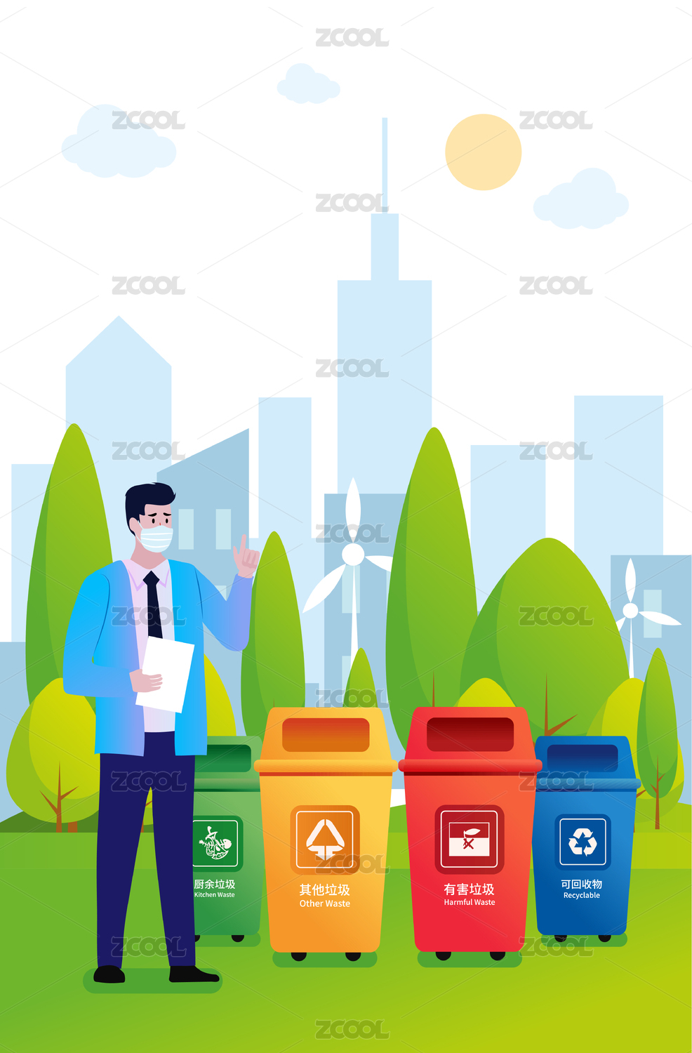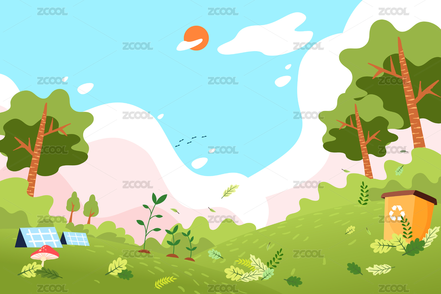卡通环保低碳出行自行车交通出行方式垃圾分