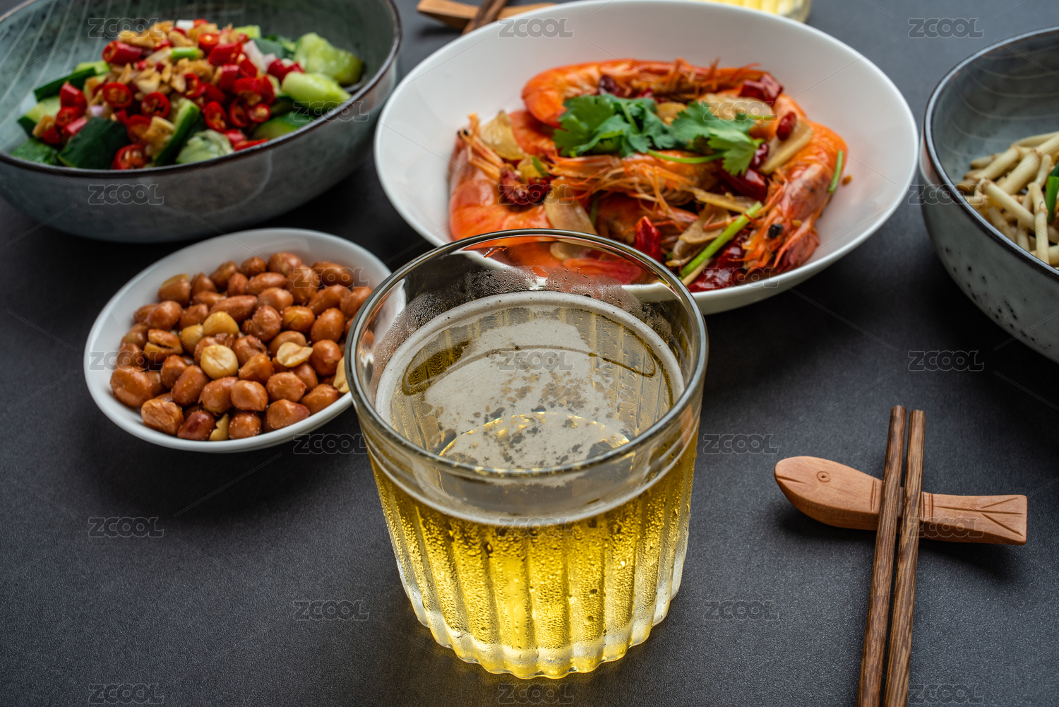 两杯啤酒和家常小菜香辣虾凉拌黄瓜