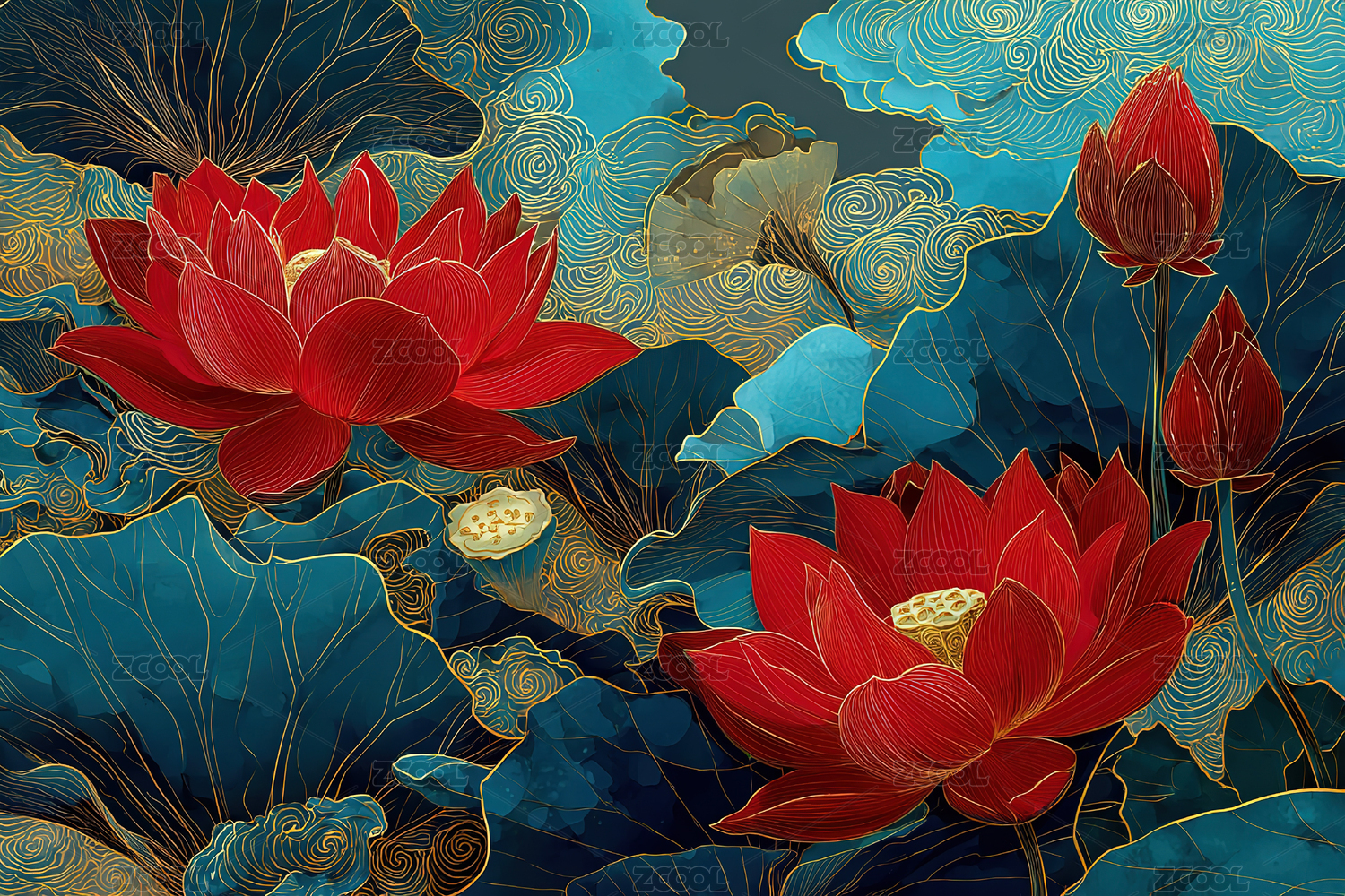 水墨,国风,中式,荷叶,水墨风,意境,荷花,金色,鎏金,黑金