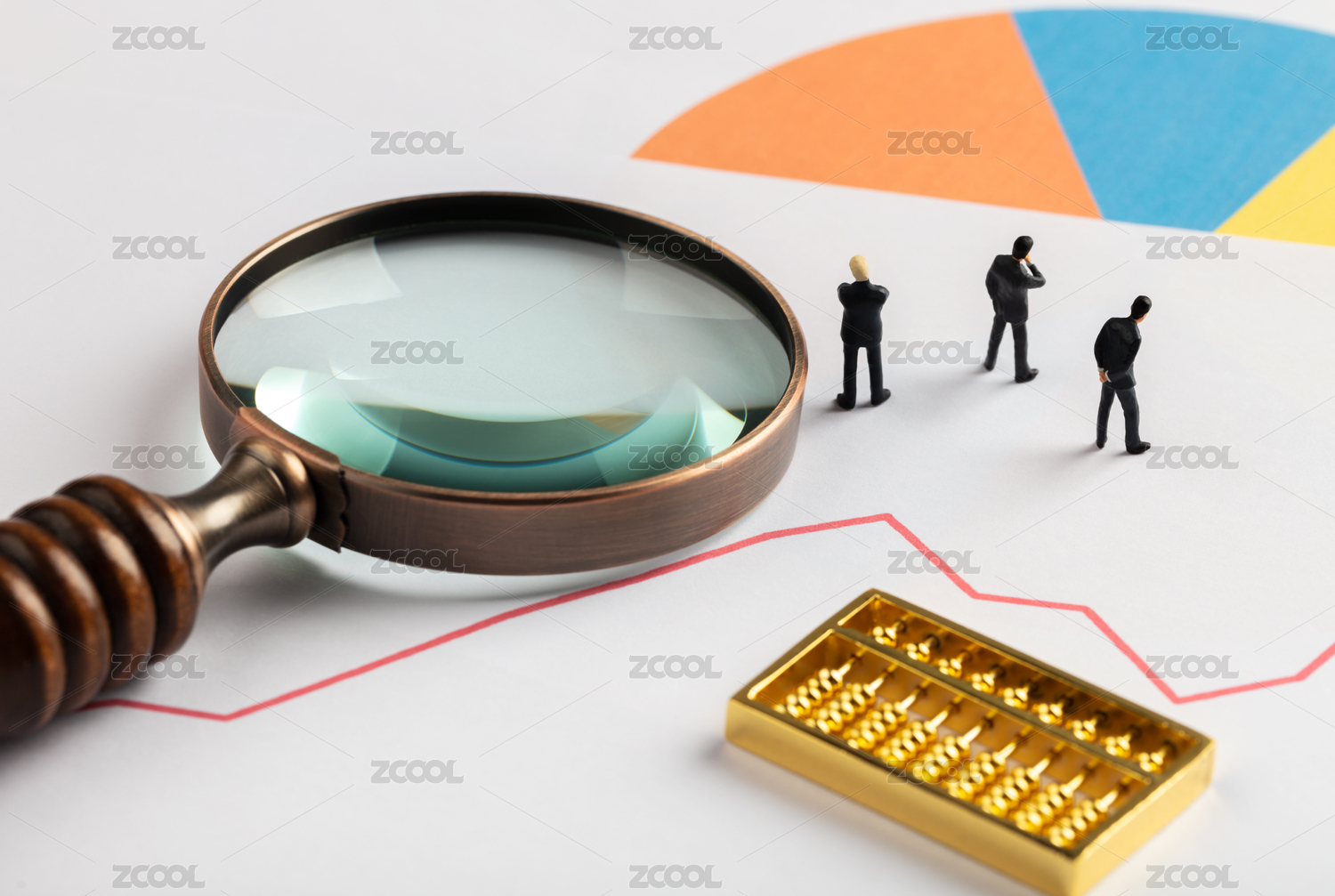 图表放大镜金算盘上思考的三个商务男性