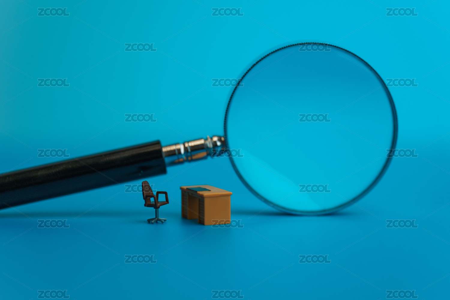 蓝色背景下放在放大镜旁的办公桌微缩创意图