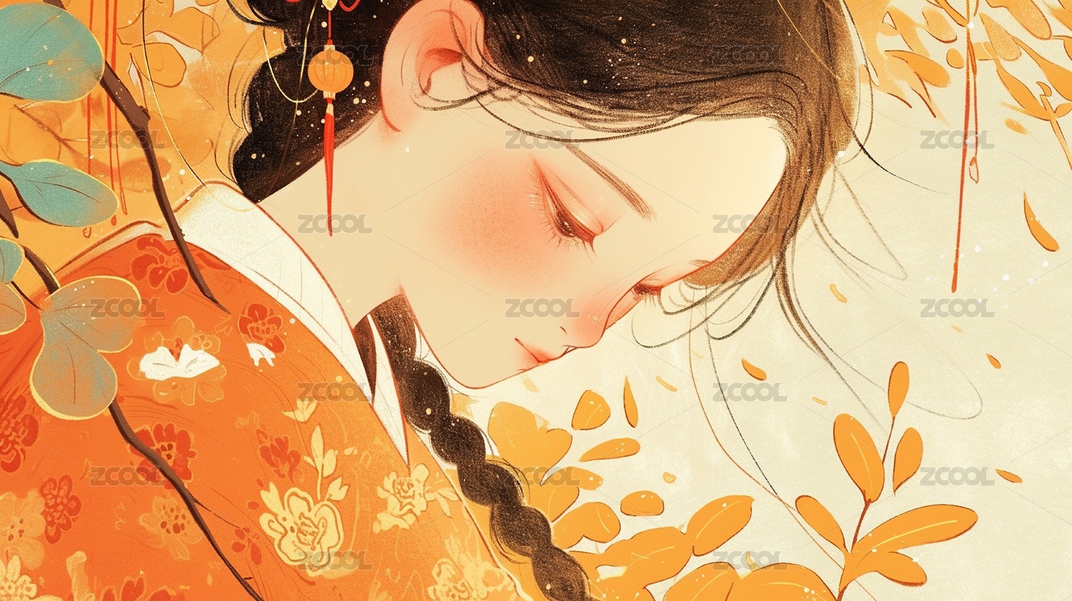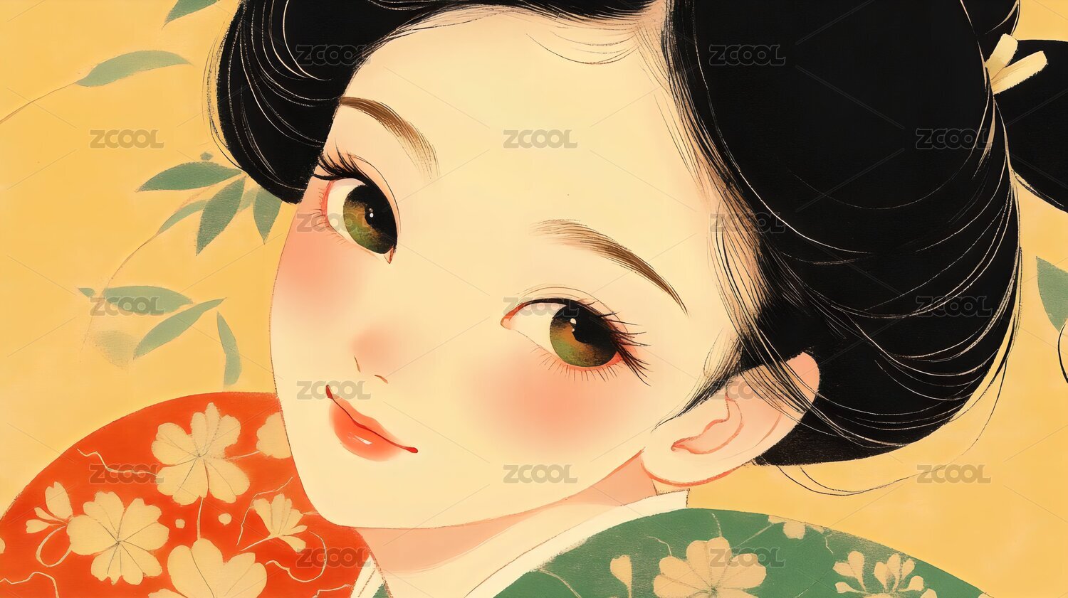 身穿和服的女子背景点缀绿叶