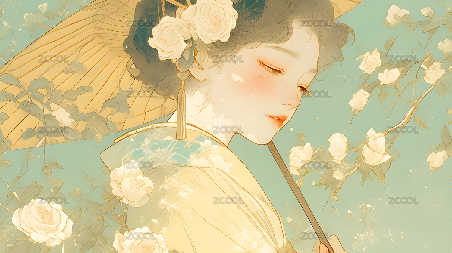 和风美人手持油纸伞赏花