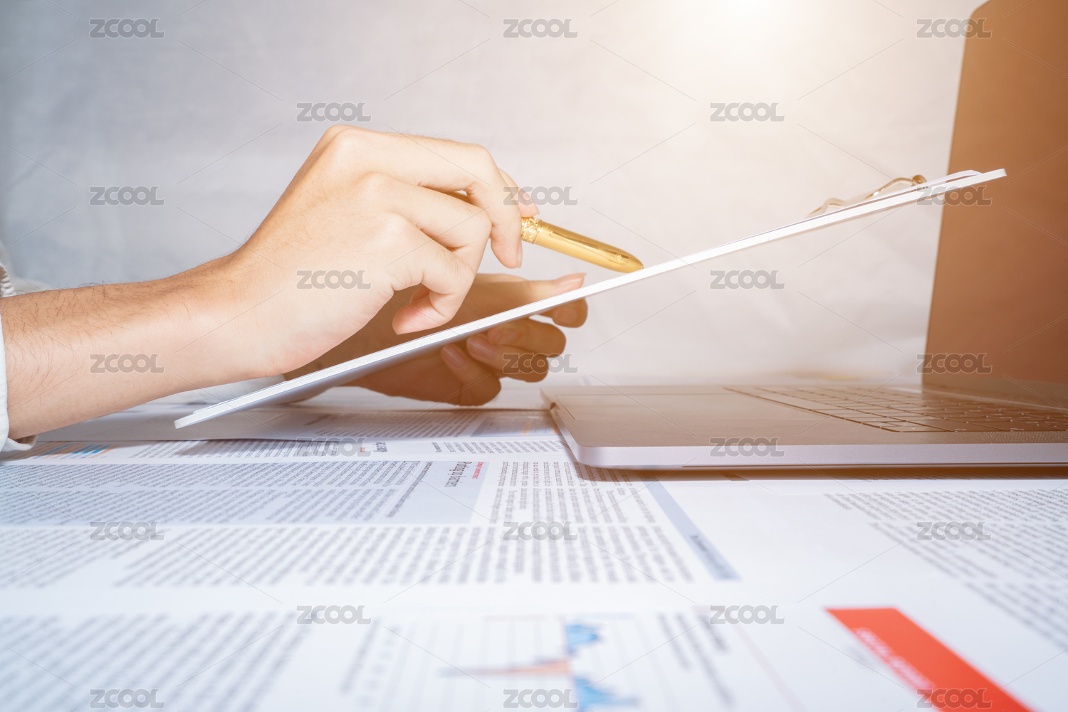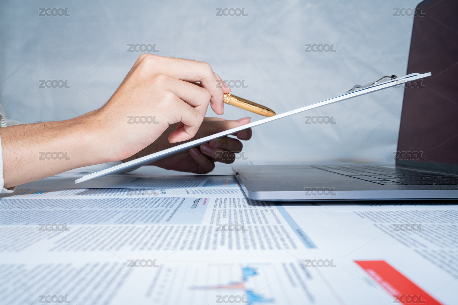 商务人士拿着办公夹和报表金色钢笔分析数据行情财经金融经济概念
