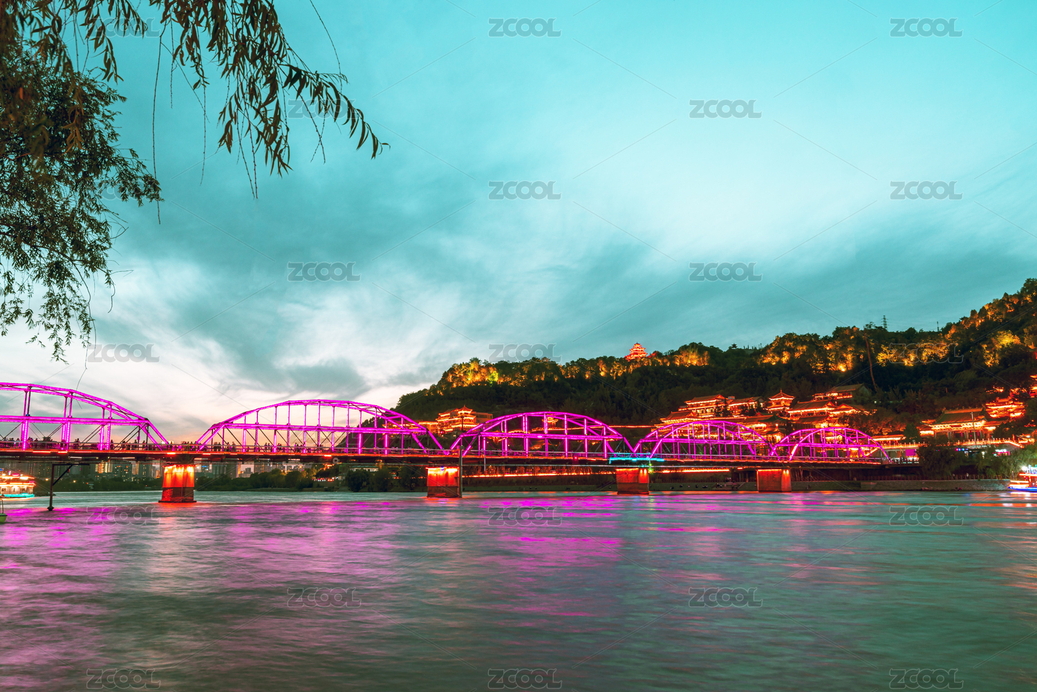 甘肃兰州中山桥塔子山夜景黄河城市风光