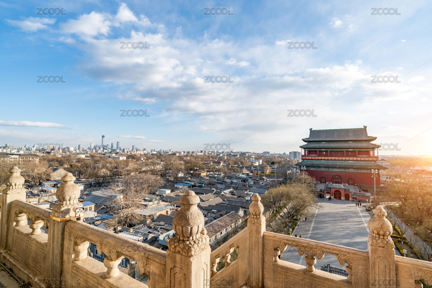 晴朗蓝天下北京钟鼓楼与胡同的景观