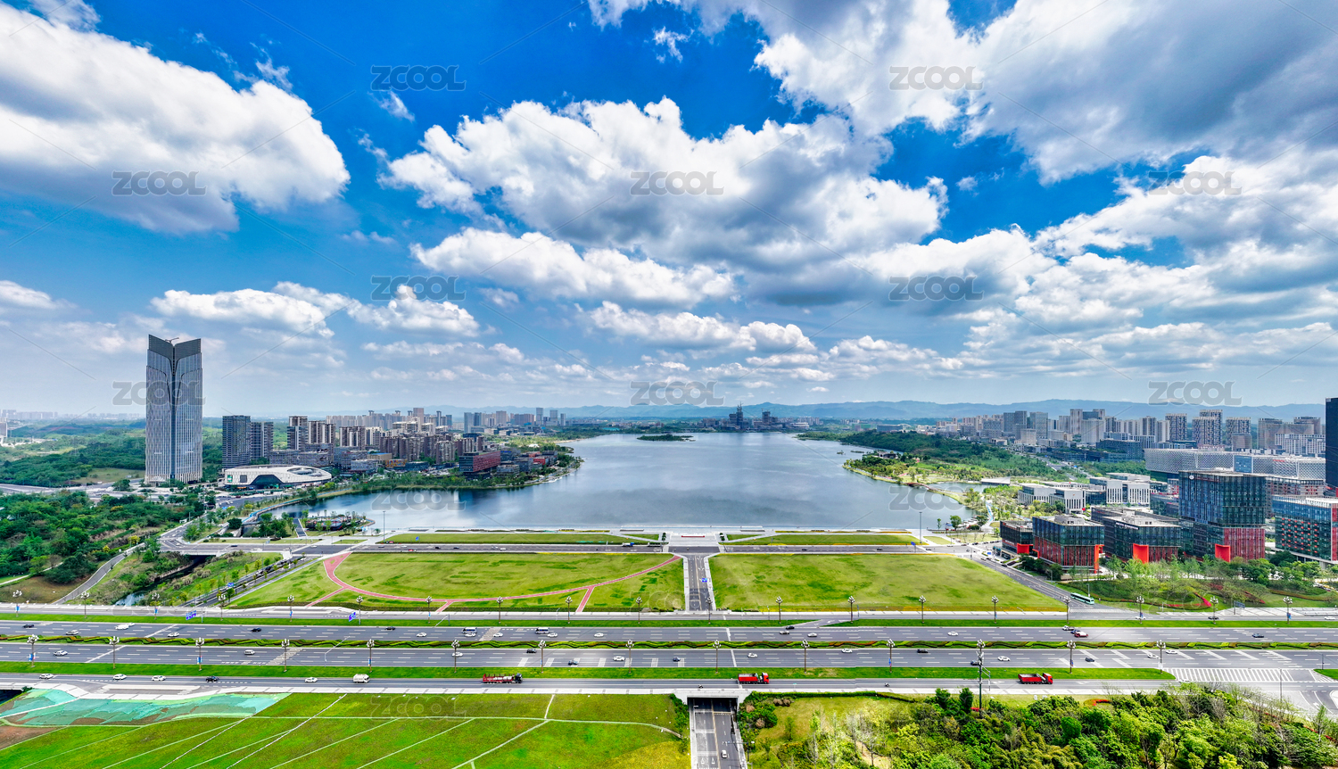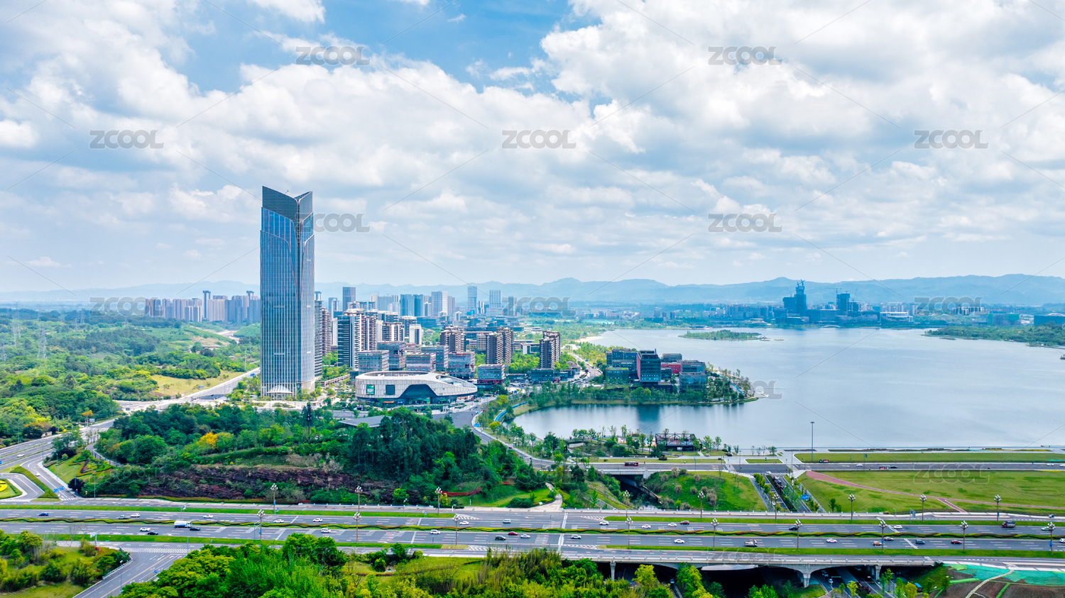 中国成都天府新区秦皇湖天府公园风光航拍图