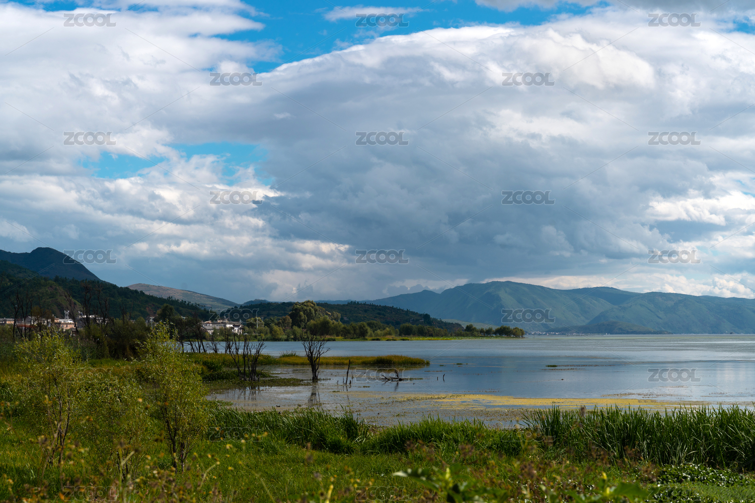 中国云南省丽江市,拉市海湖泊前的空旷草坪