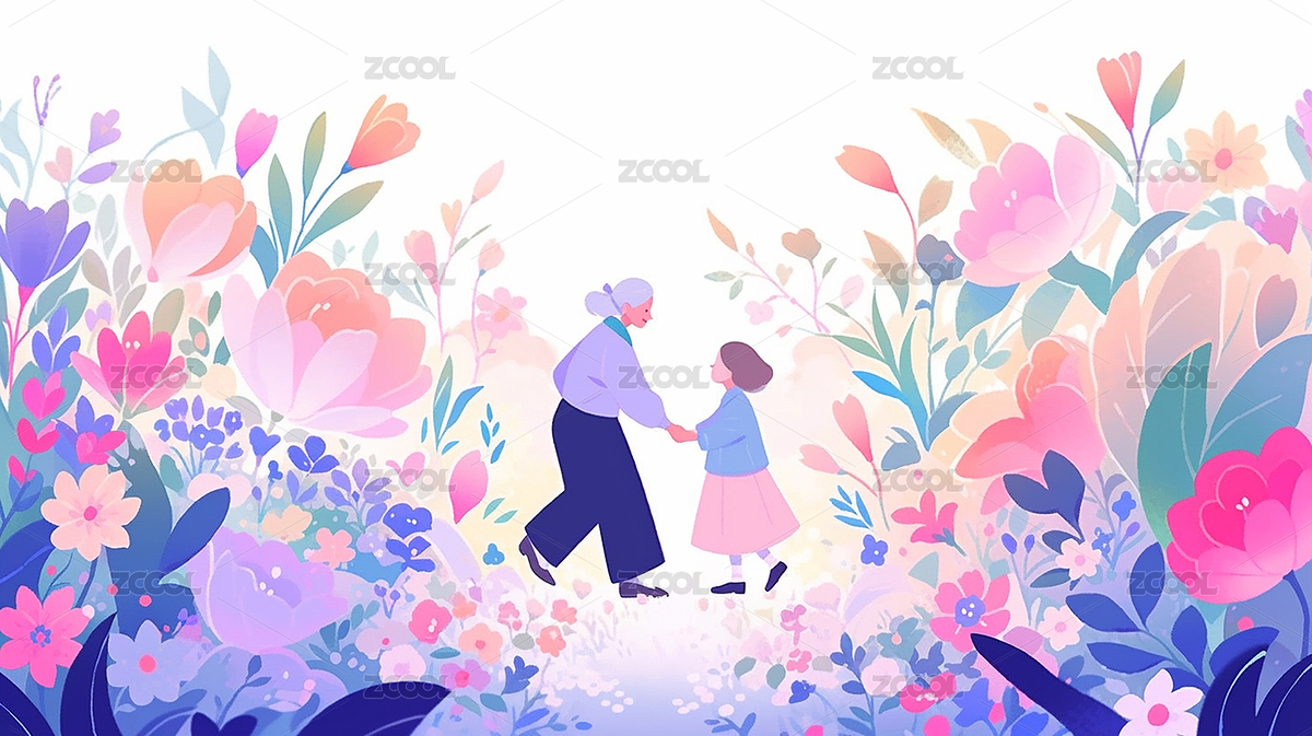 美丽花树下亲人老人牵手陪伴到老温馨插画