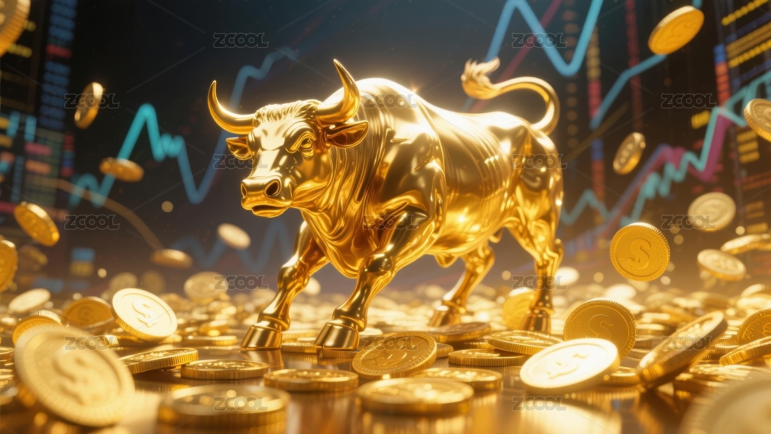 金色铜牛与红色图表