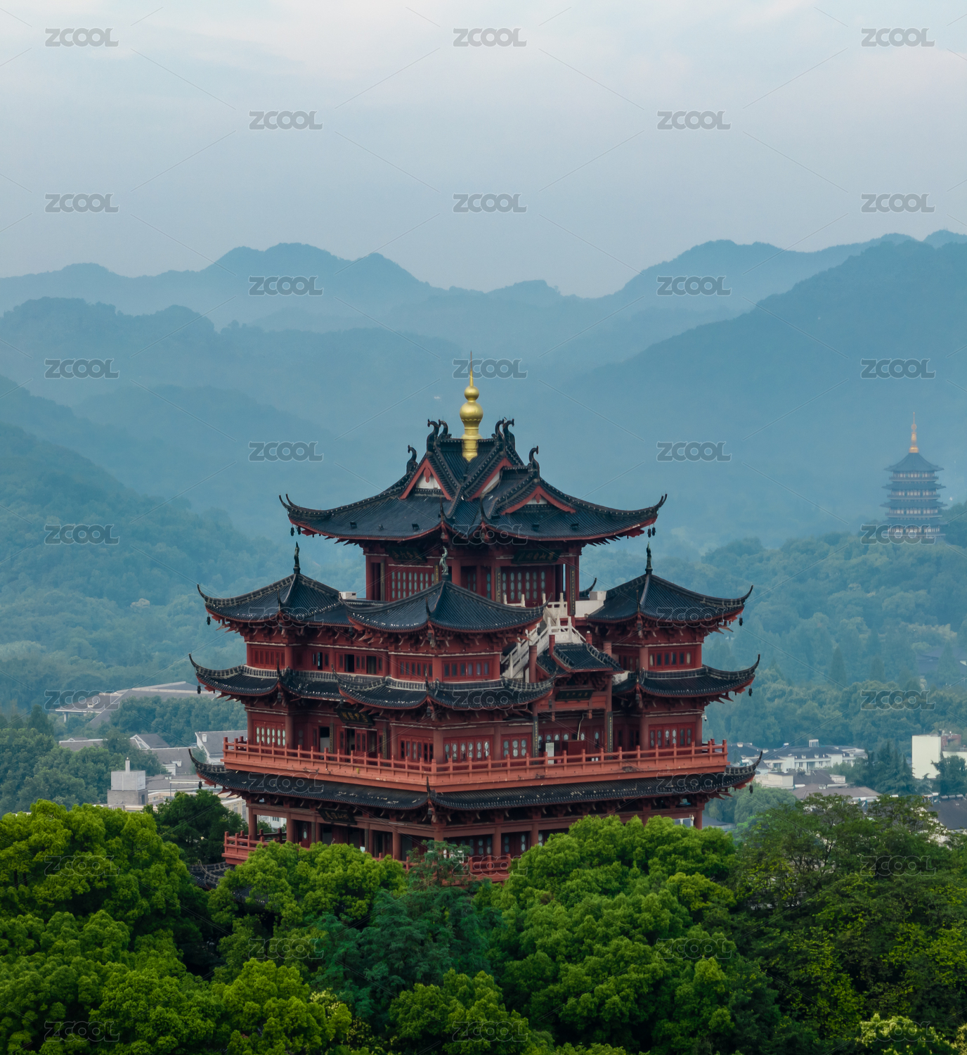中国浙江杭州西湖雷峰塔建筑和自然风光