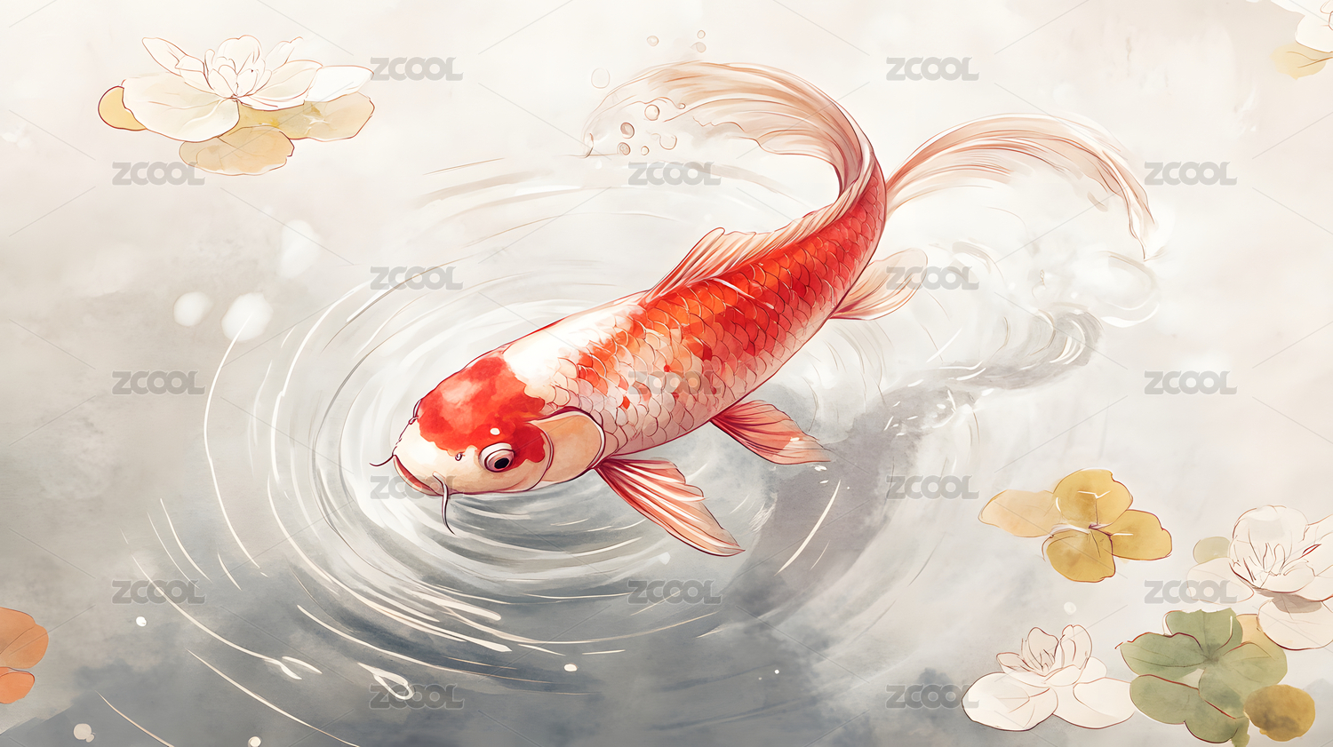 金鱼跃动水彩画风