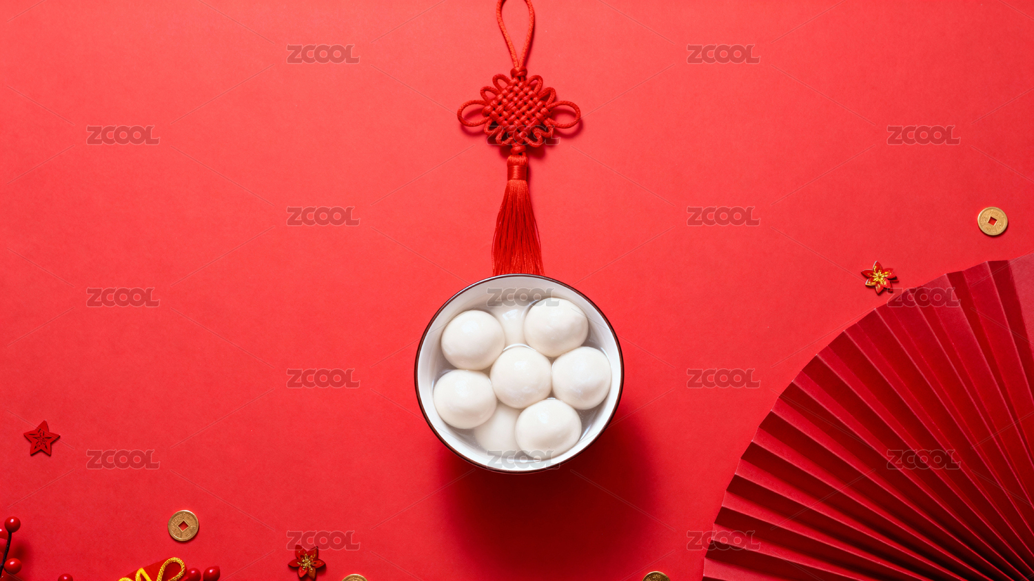 红色背景留白的中国新年传统装饰品静物和汤圆