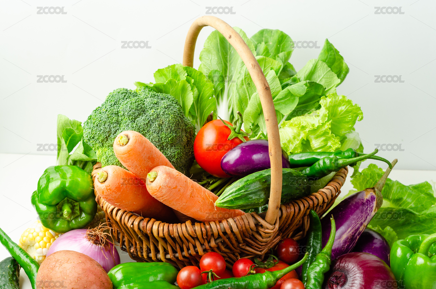 装着新鲜水果蔬菜的菜篮子放在白色背景里
