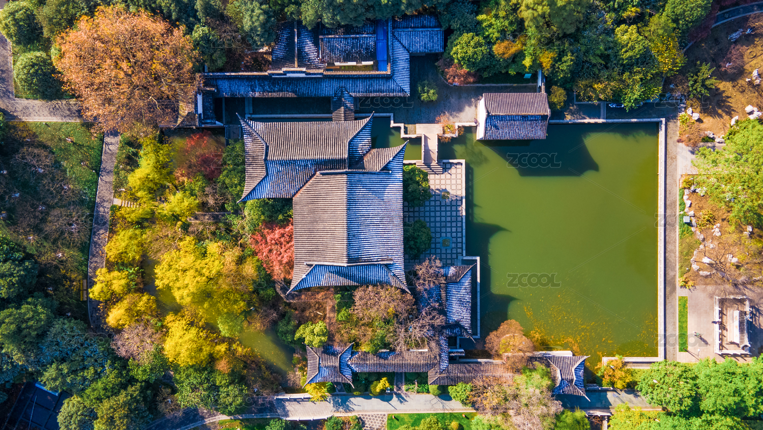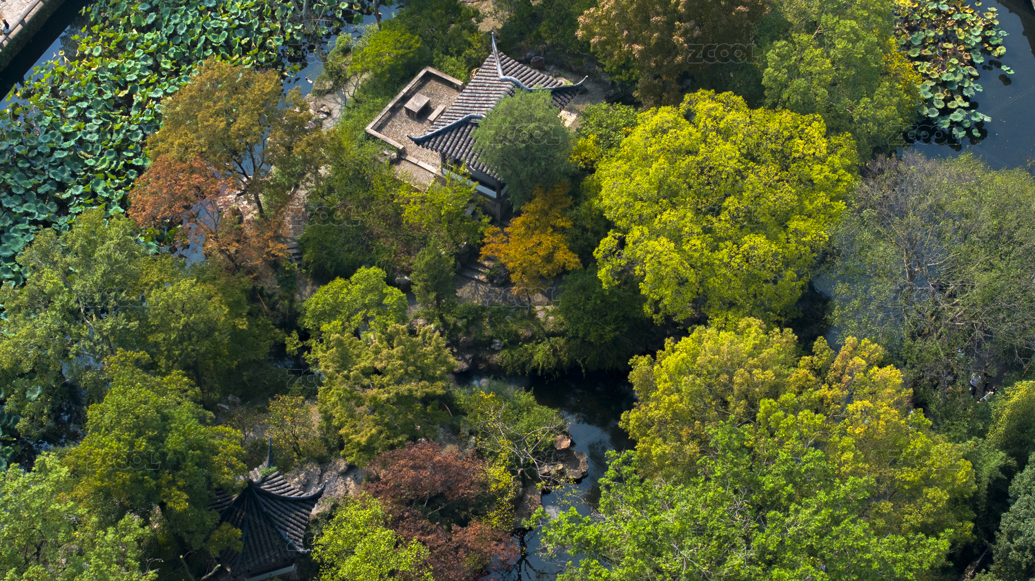 航拍江苏省常州红梅公园园林、知音舫秋景