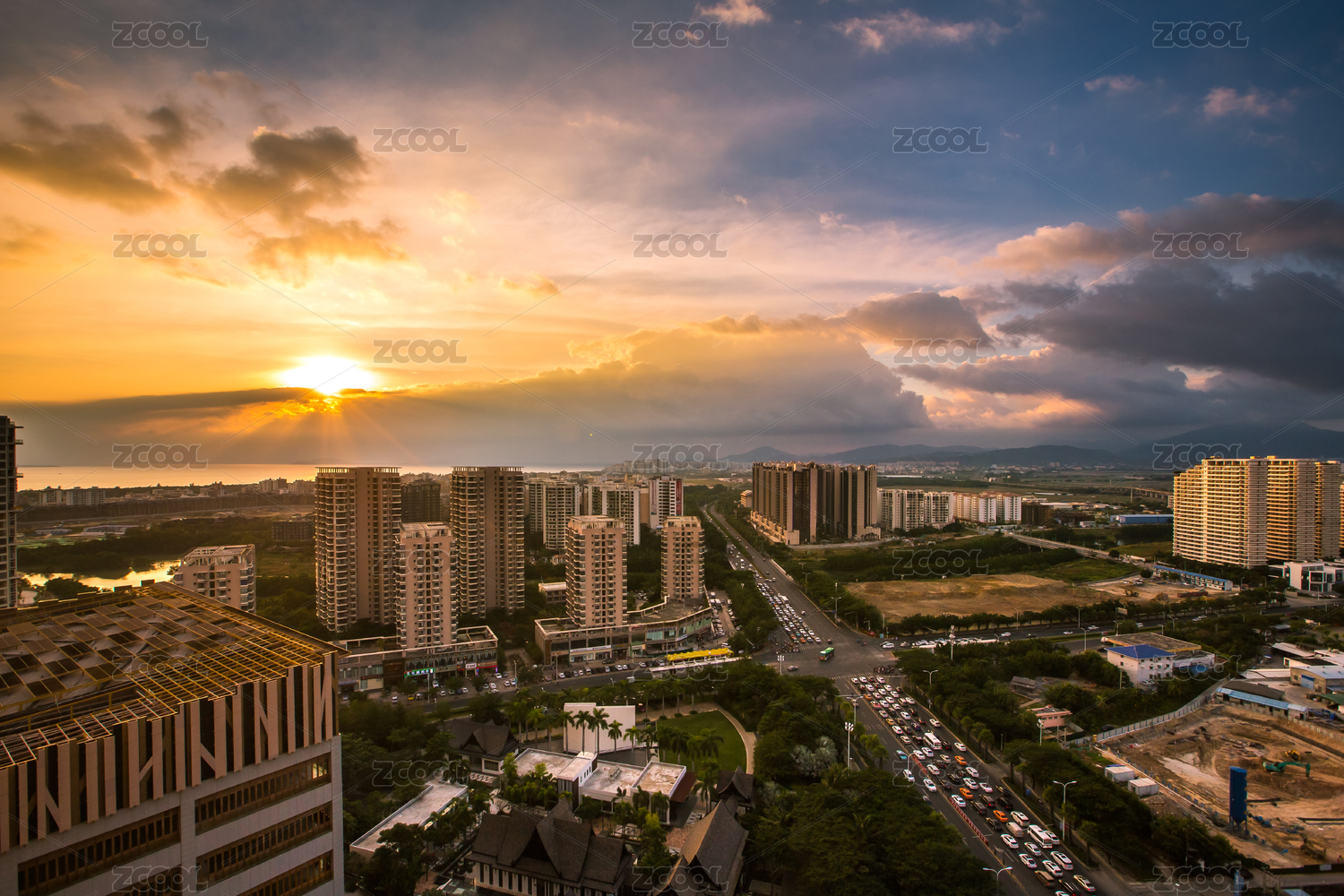 傍晚夕阳下的城市建筑群楼和公路景观
