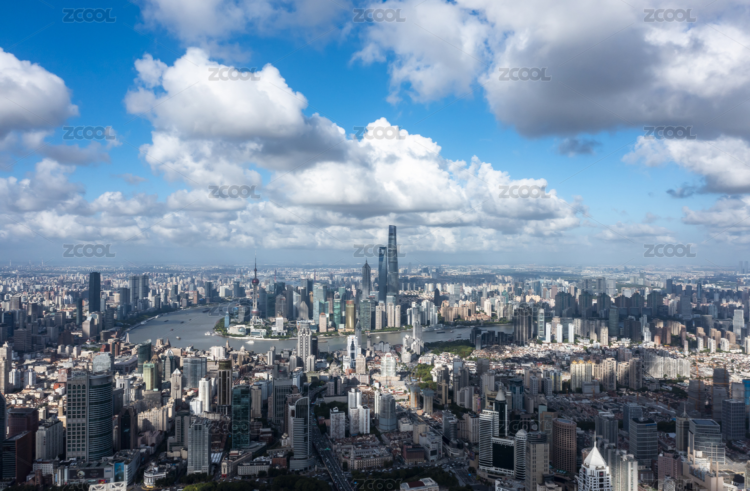 航拍蓝天白云下的上海黄浦江两岸的风光