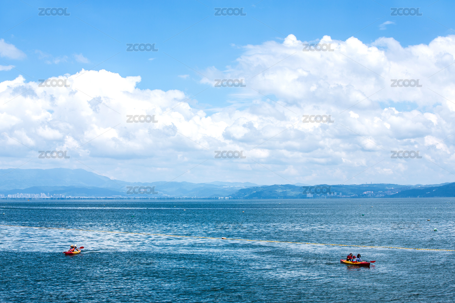 水天一色的中国云南省玉溪市澄江县抚仙湖上飘荡的帆船