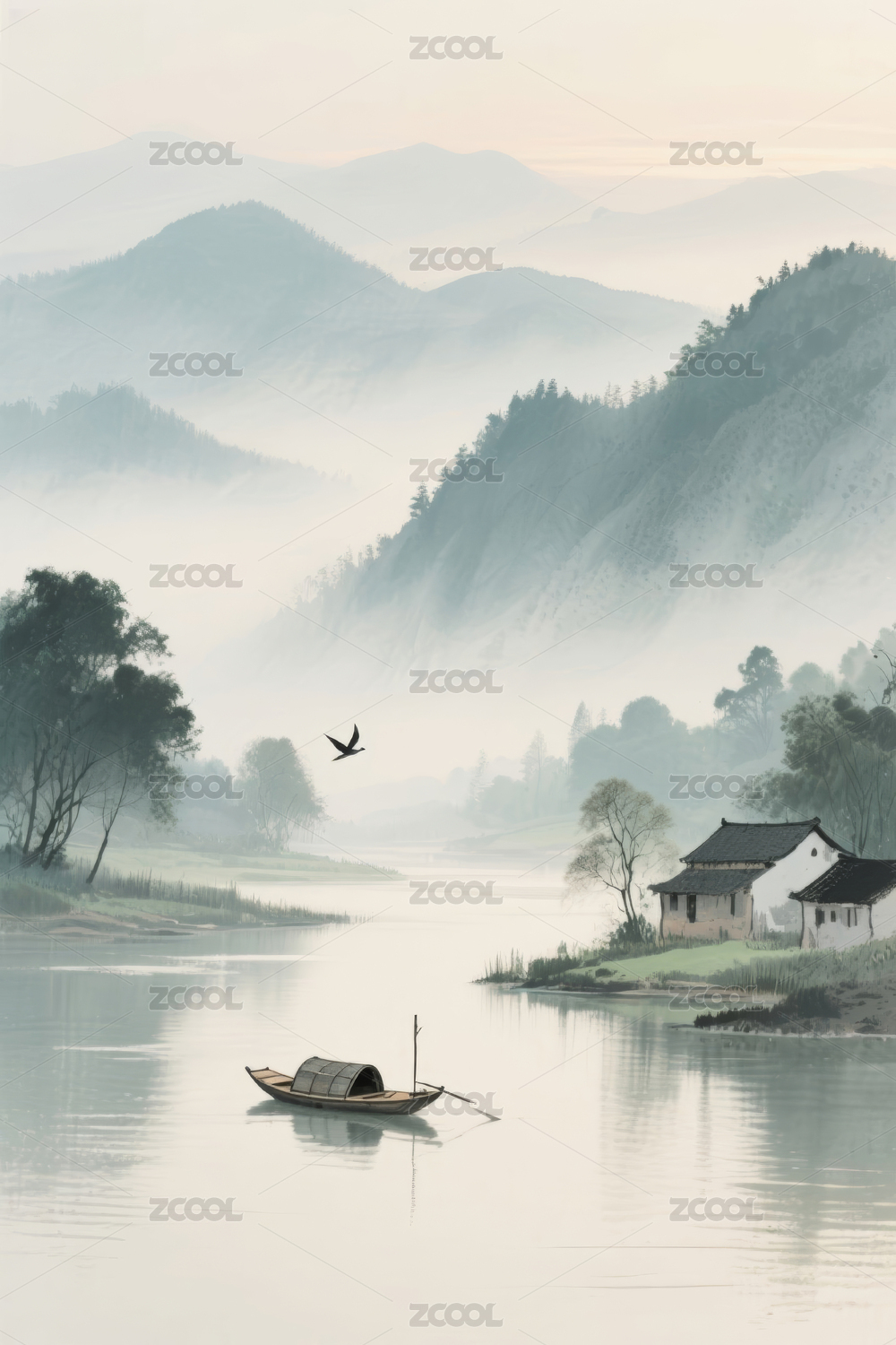 山水晨雾渔舟