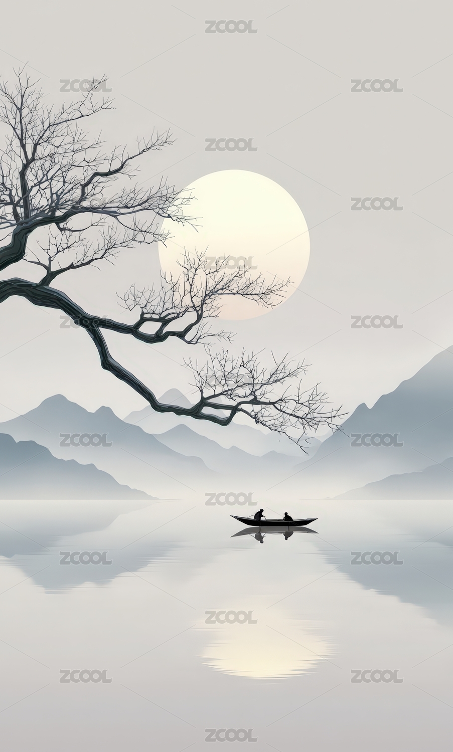 水墨山水孤舟明月景