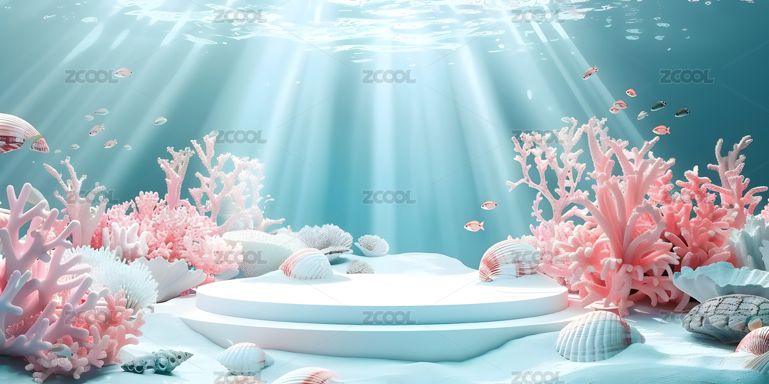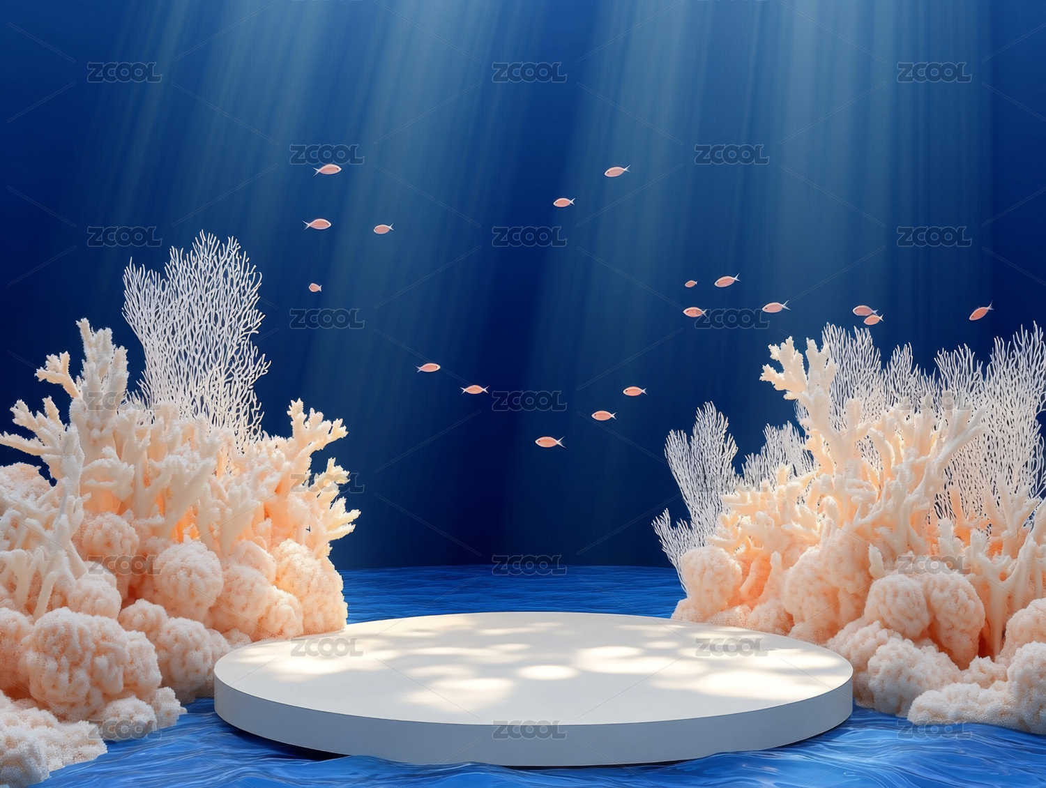 蓝色海水珊瑚海草窗户产品展台三维插画