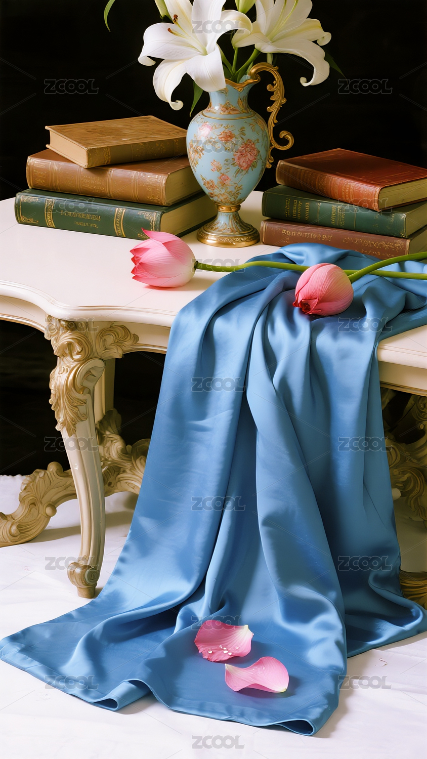 旧书石榴玻璃杯在蕾丝桌布木桌上