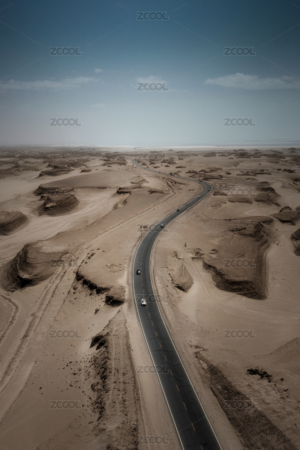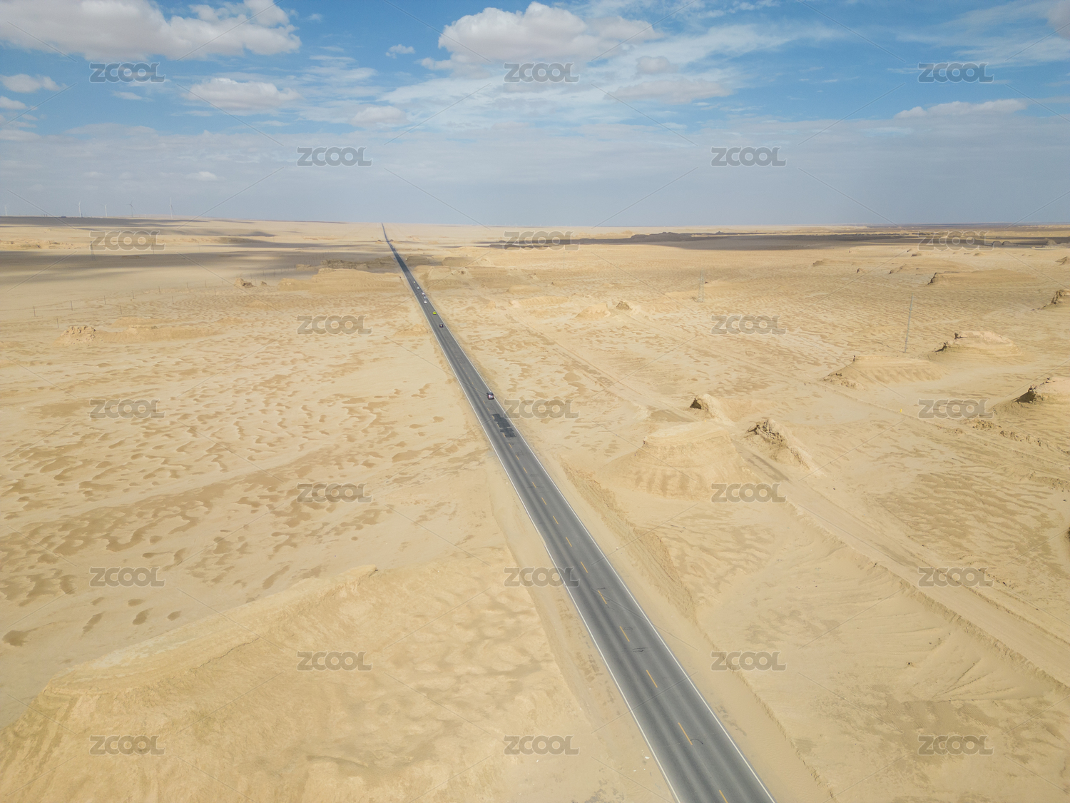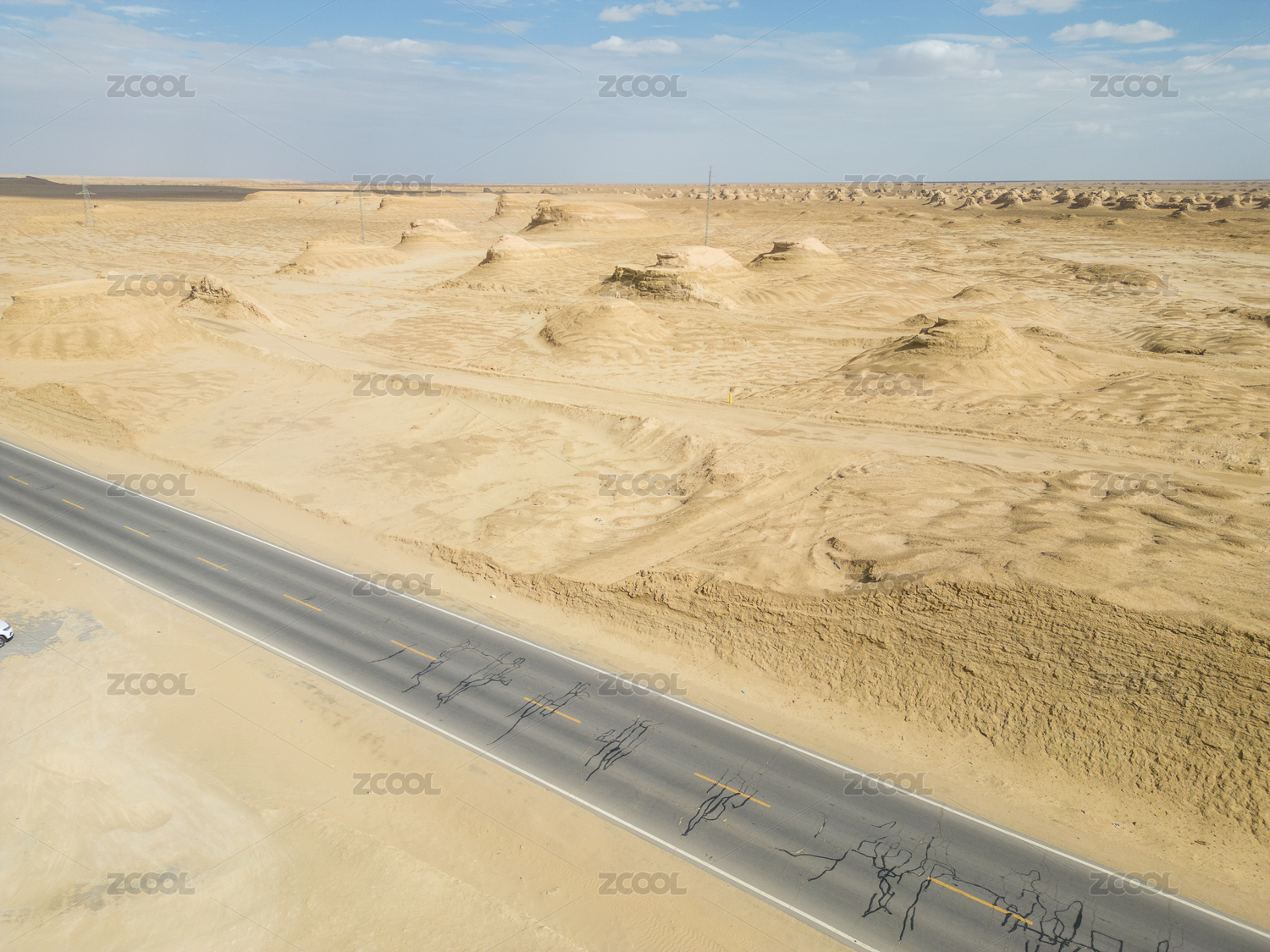 戈壁中的雅丹地貌与孤独的公路