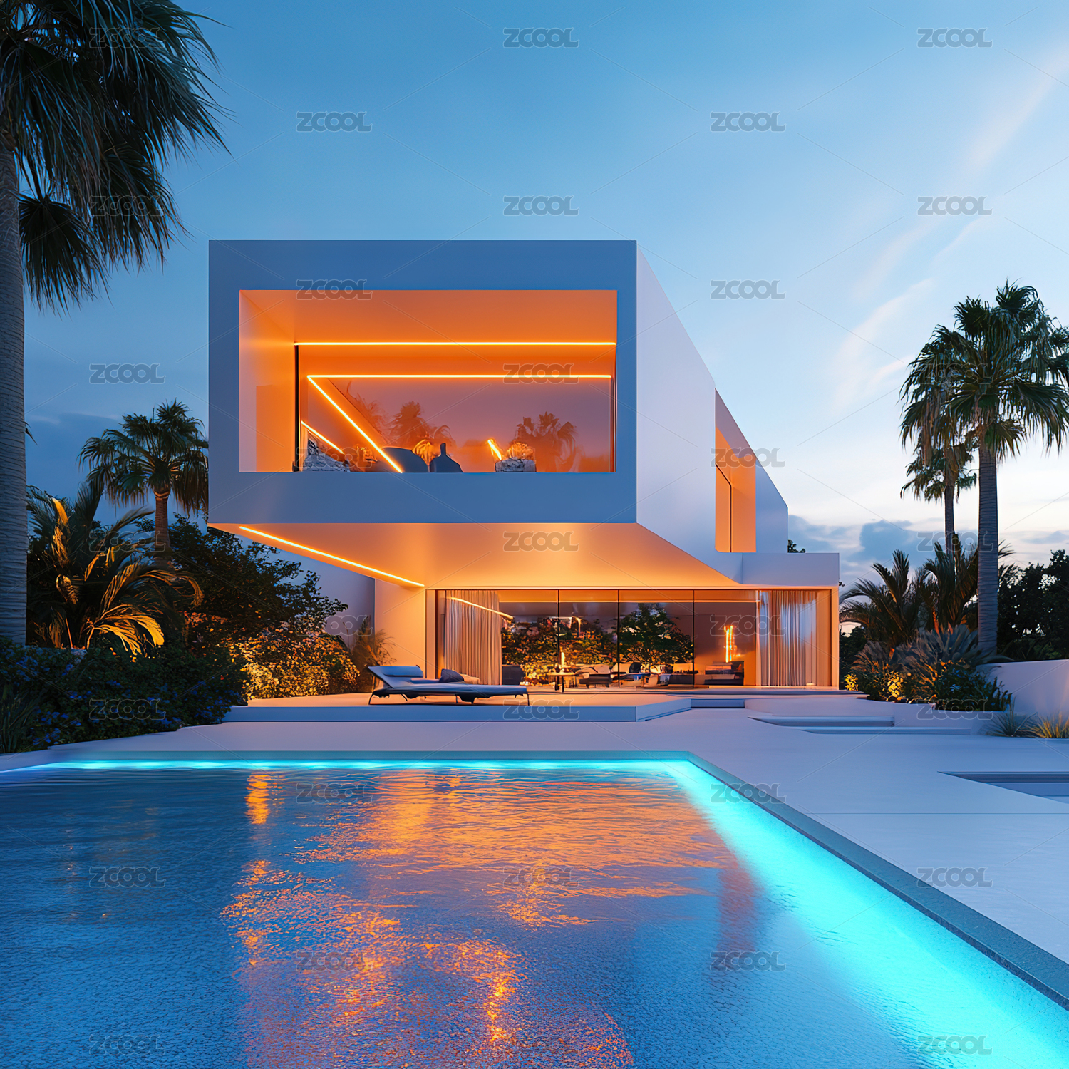 现代别墅夜景泳池与绿植环绕