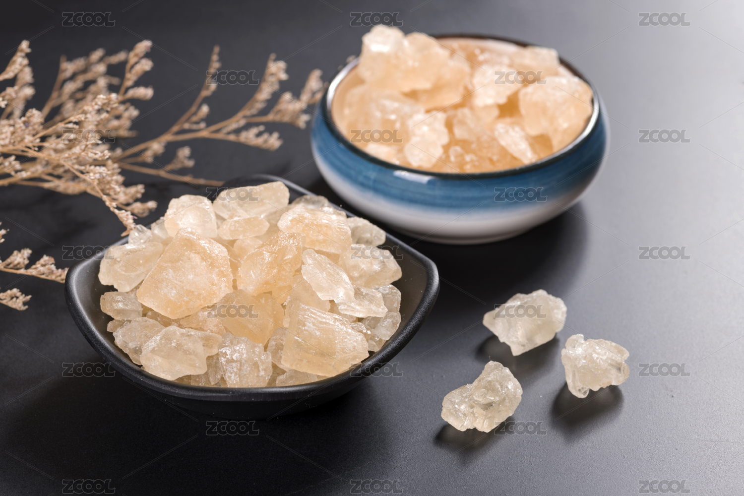 盛放在碟子中的黄冰糖摆放在桌面上