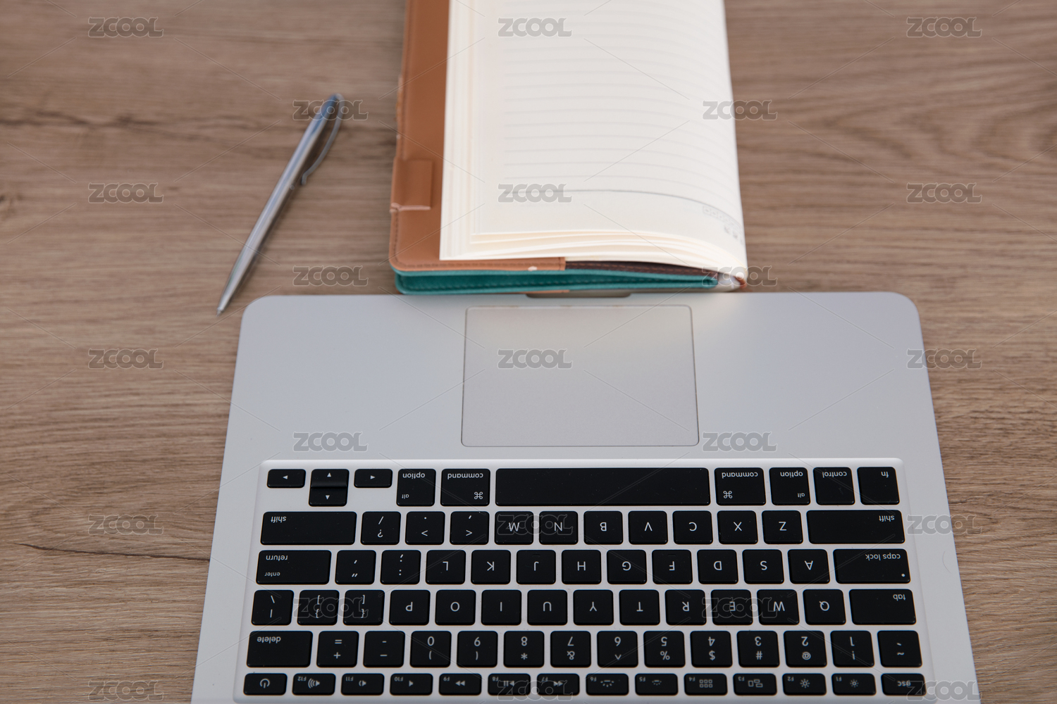 办公桌上空白的笔记本电脑、日记本、笔和一杯咖啡