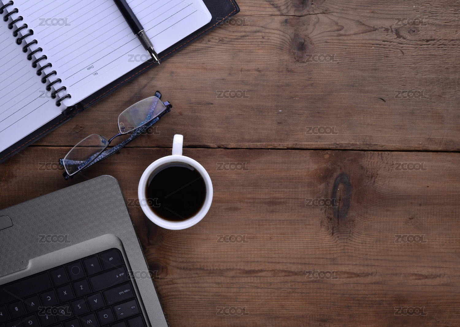 笔记本电脑,笔记本和笔与办公桌咖啡杯