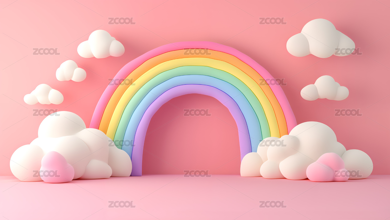 粉色背景中3D立体云朵和彩虹背景