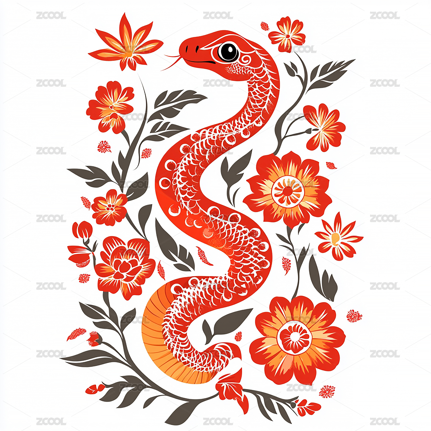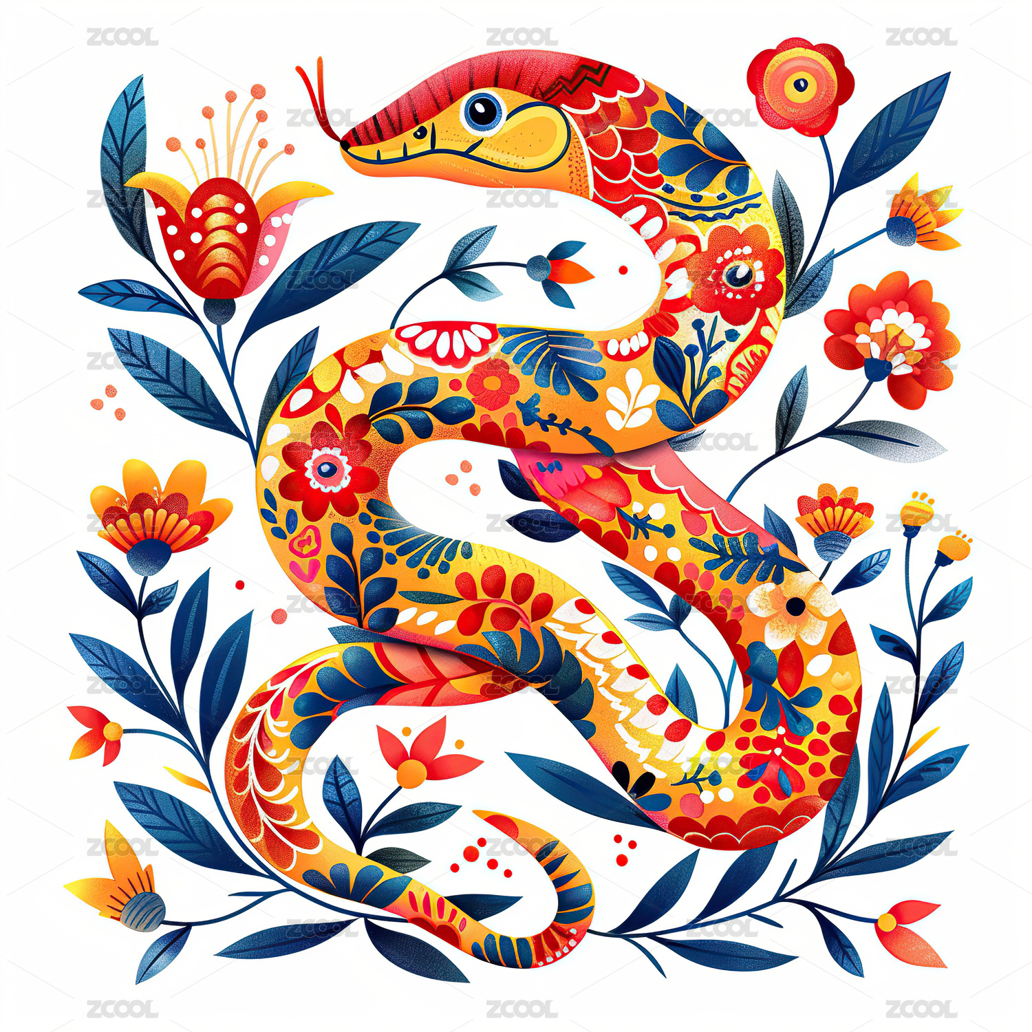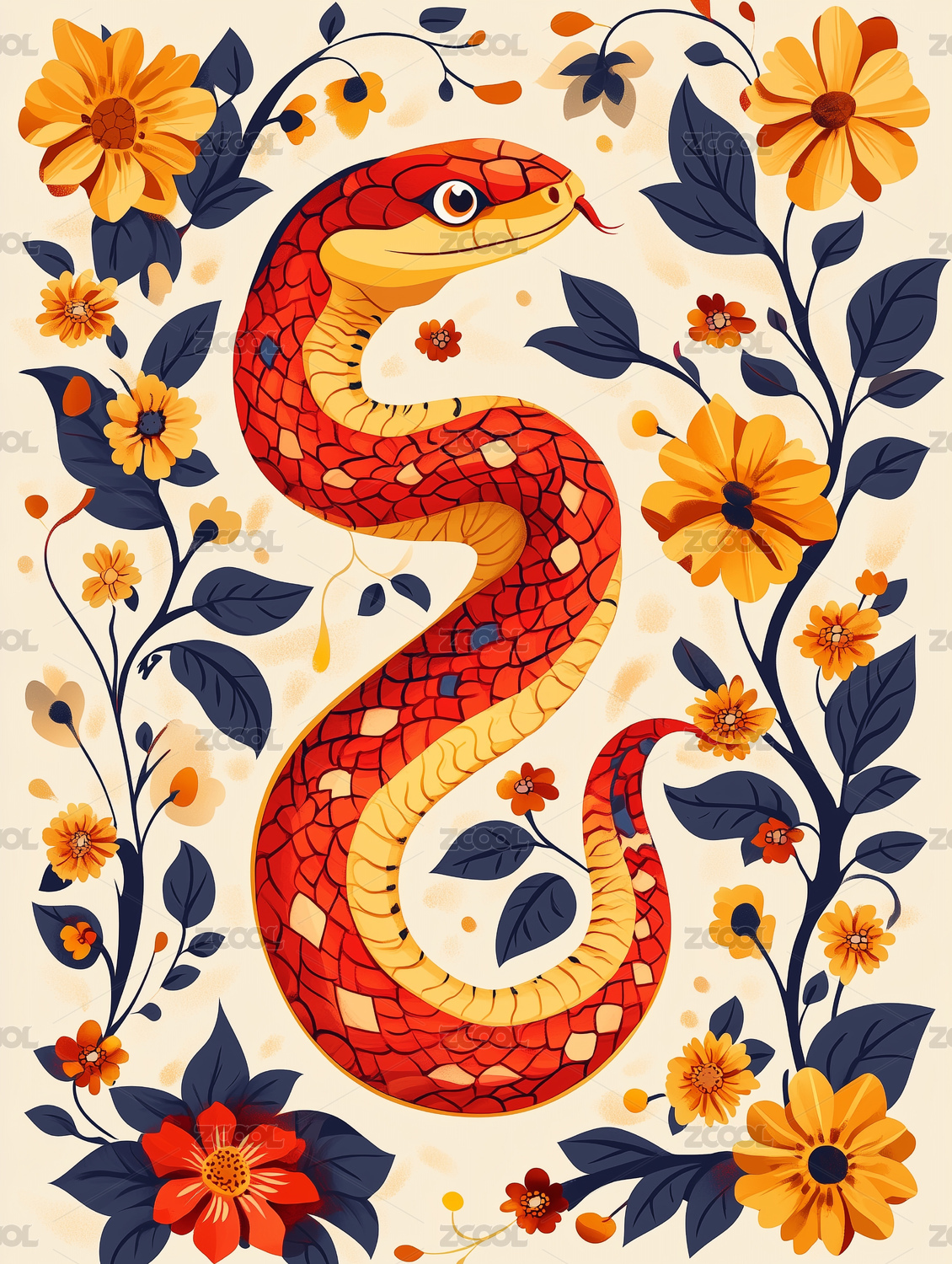 蛇,花卉,红色,黄色,几何图案,植物,生机,和谐,美丽,自然