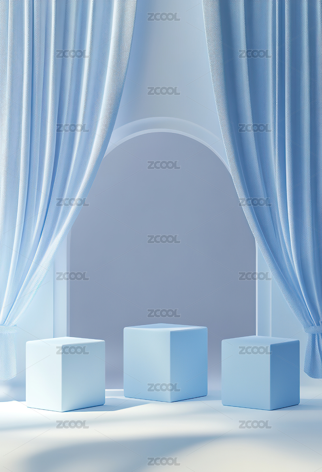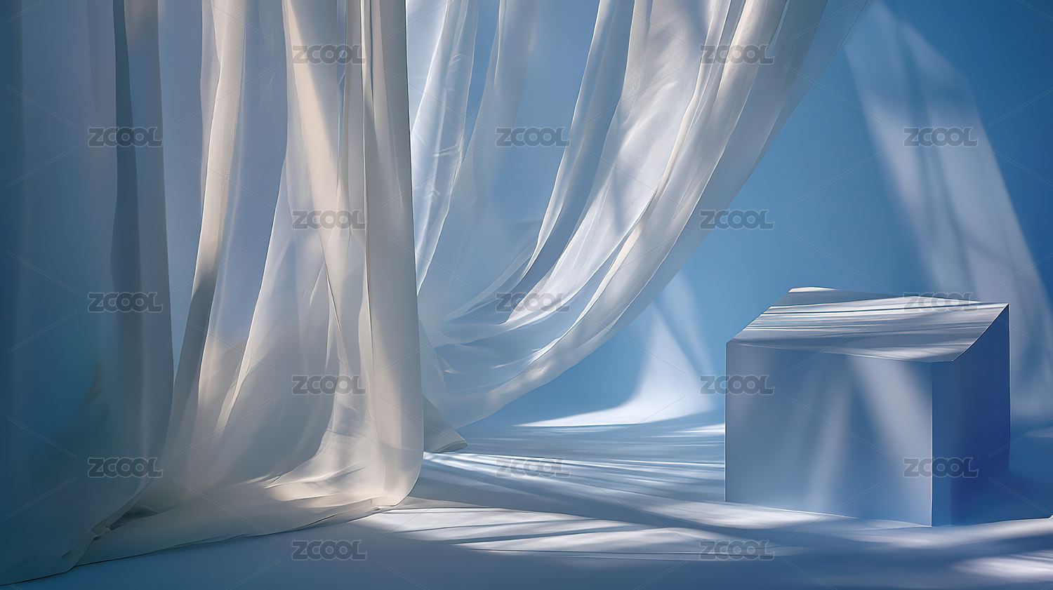 白色立方体置于蓝色窗帘前