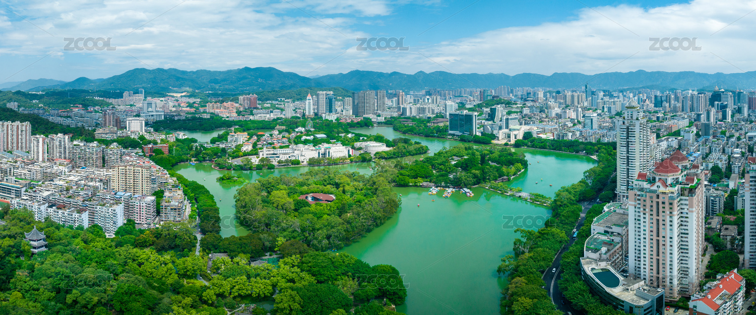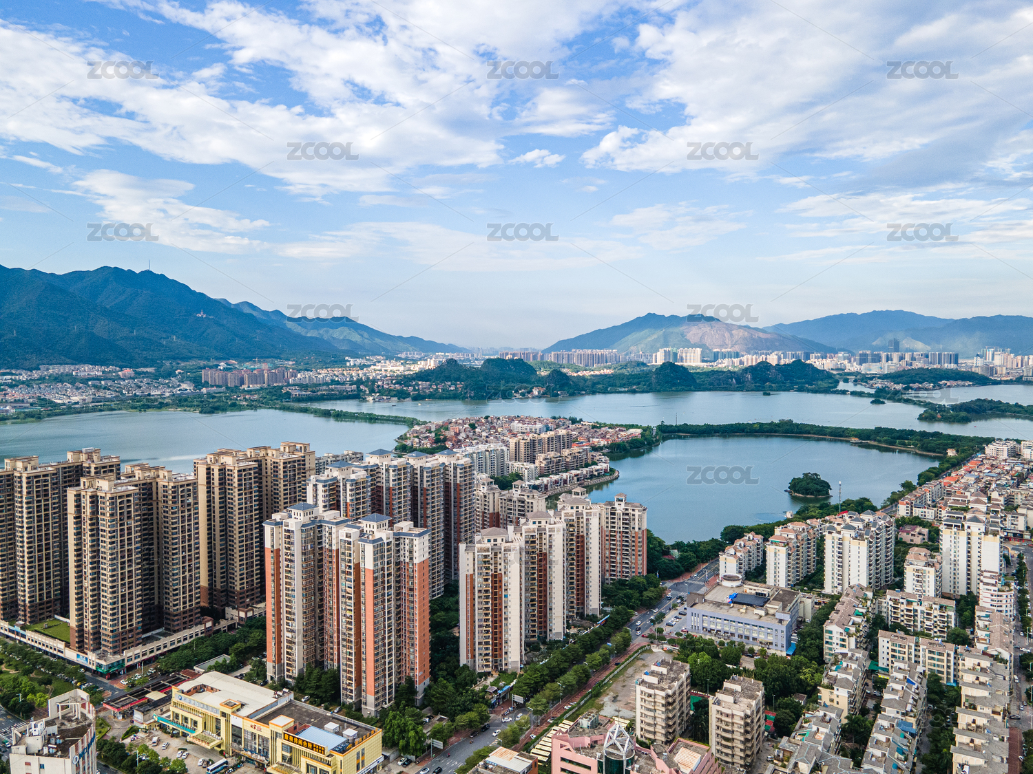 中国广东省云浮市蟠龙天湖城市天际线全景