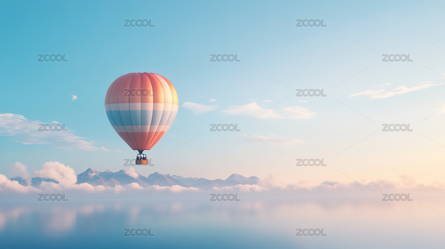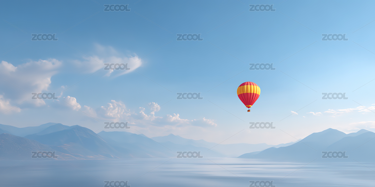 一只彩色热气球漂浮在山间湖泊上自然风景