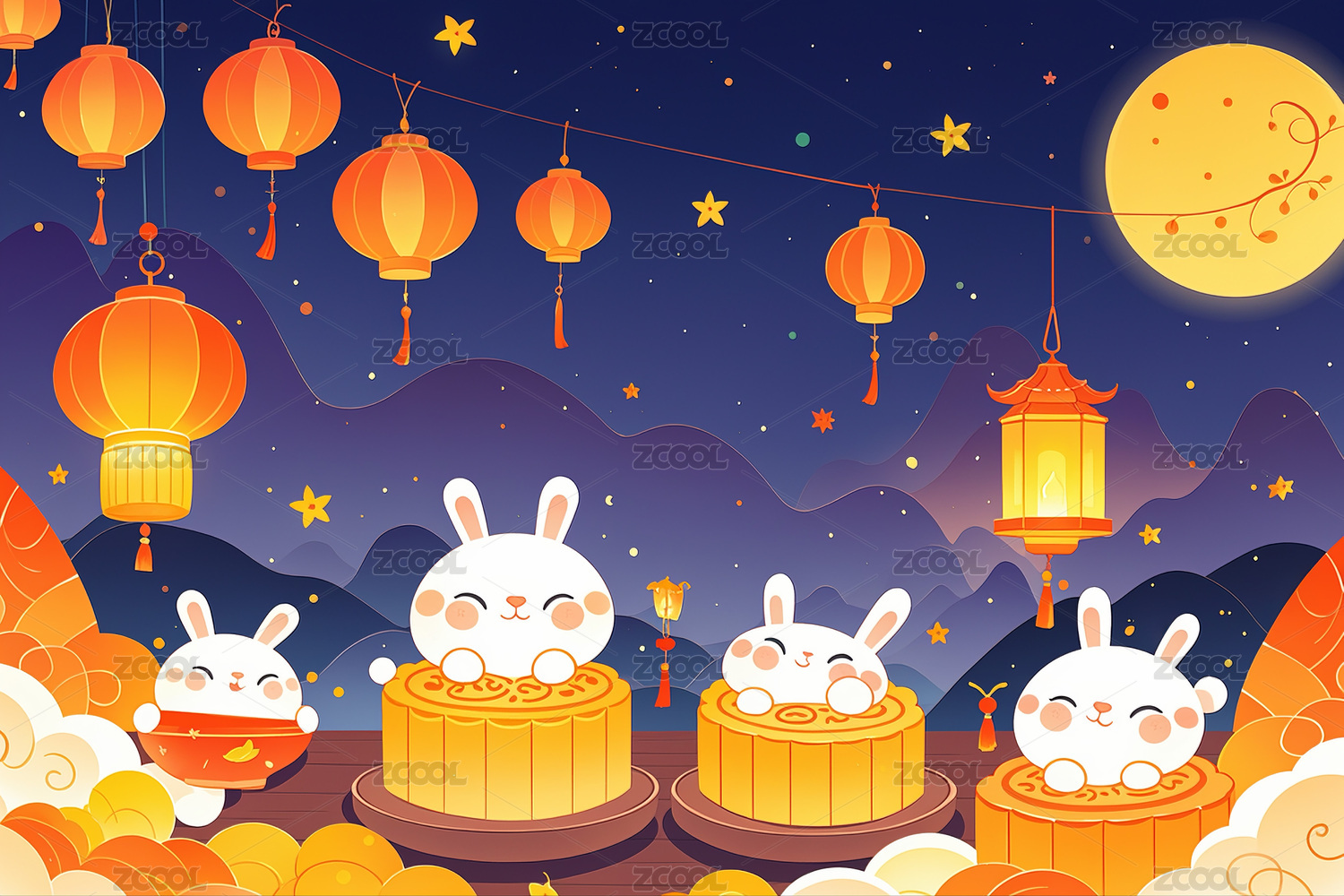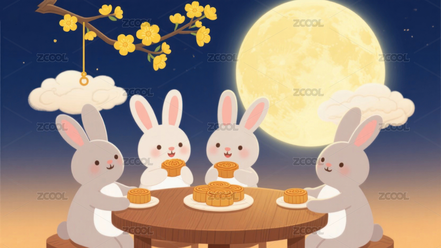 中秋节月亮下奔跑的兔子插画背景壁纸
