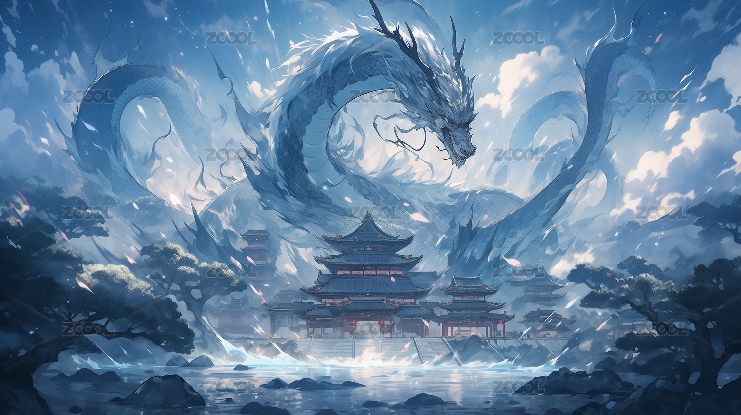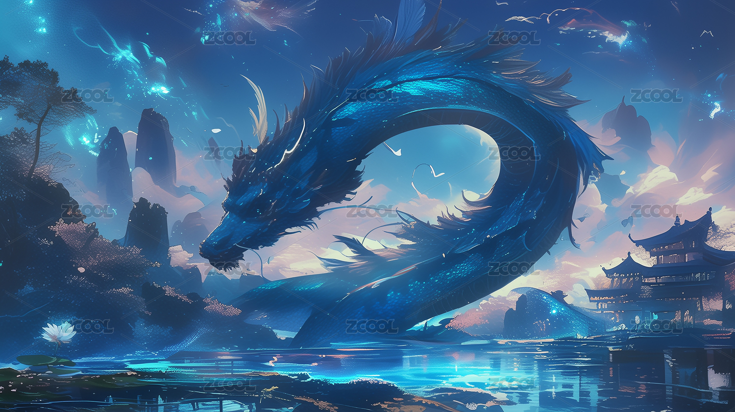 巨大蓝色中国龙插画游戏场景