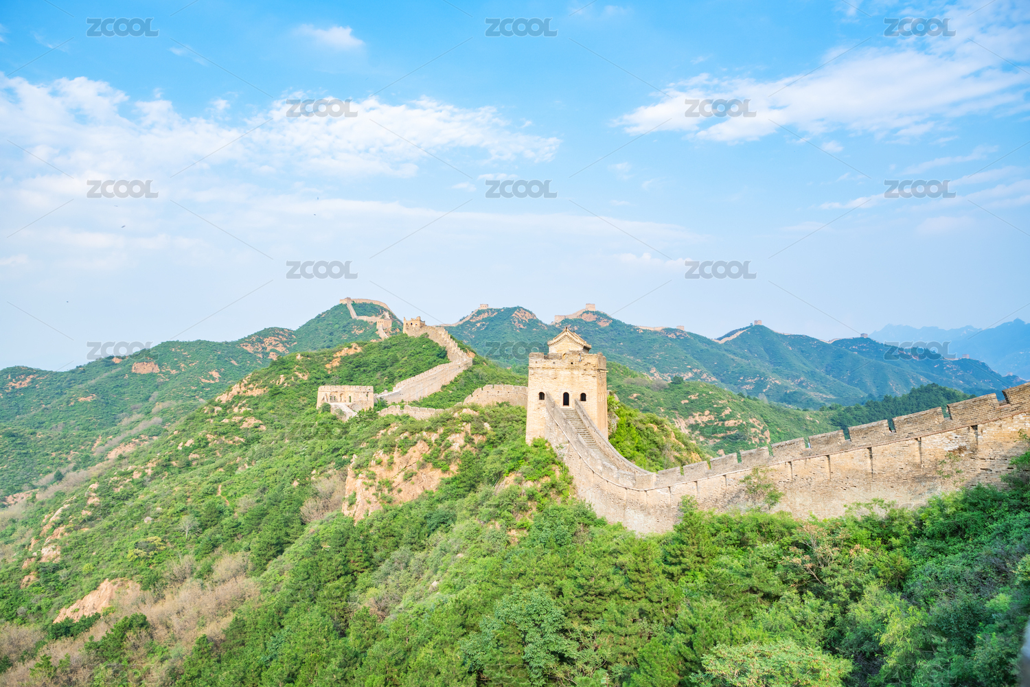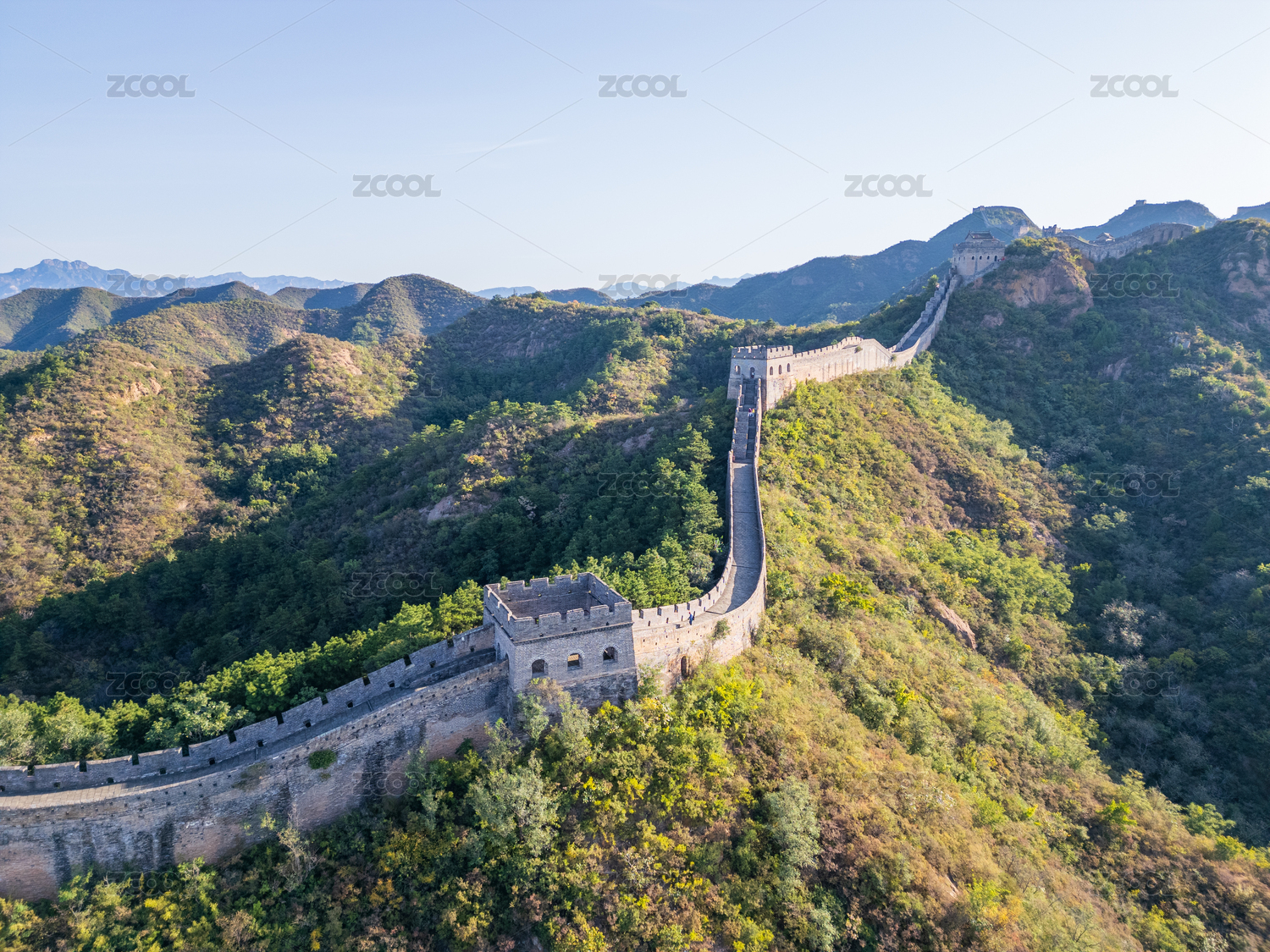 蓝天白云下的中国长城蜿蜒盘旋丛山峻岭