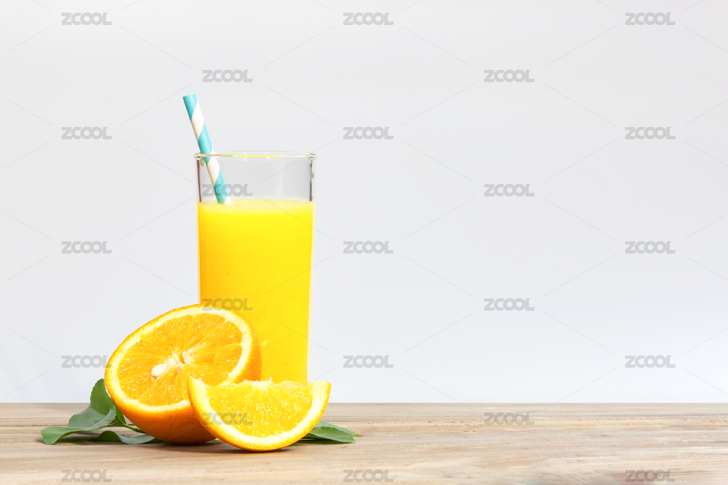 一杯橙汁和新鲜的橙子在桌子上,健康饮食