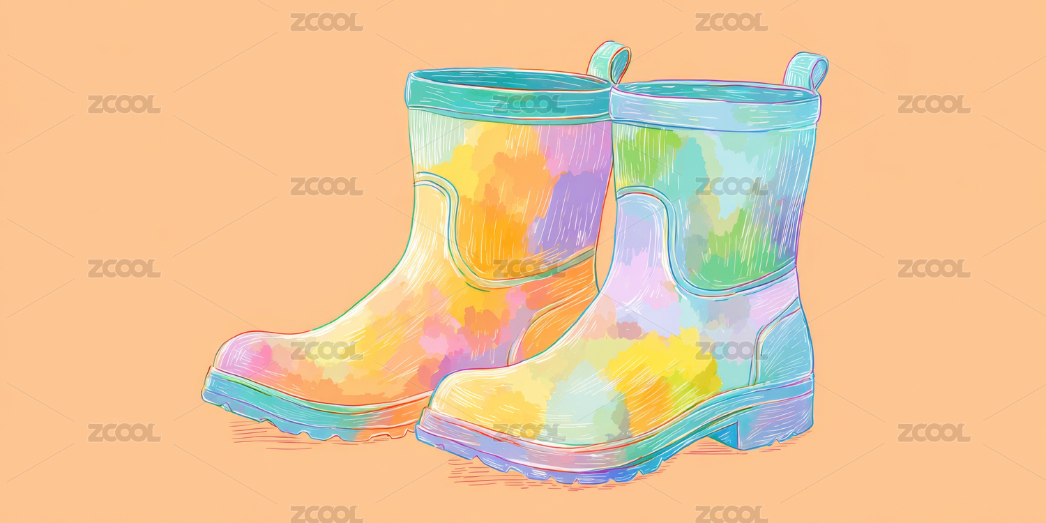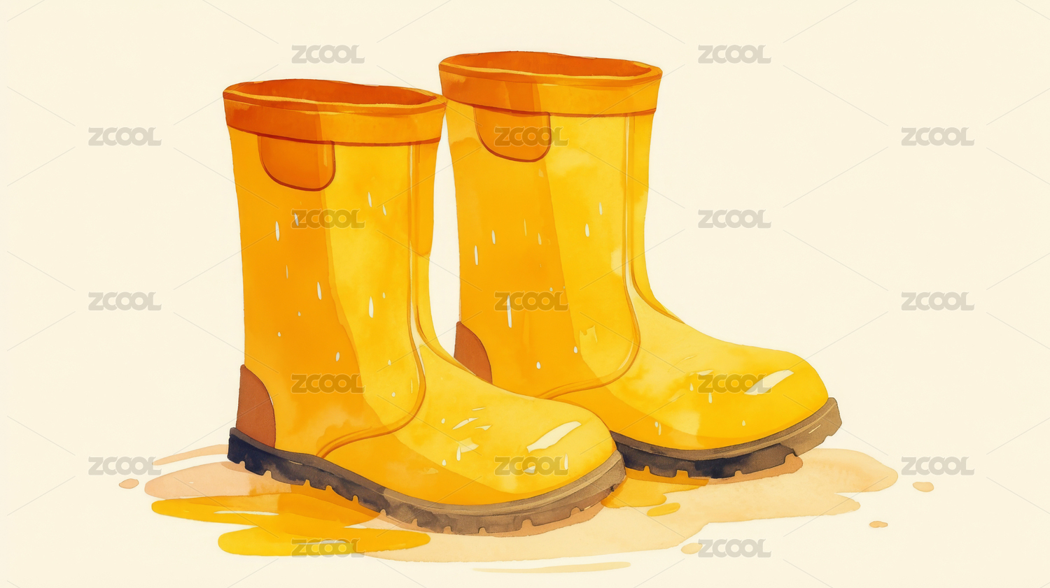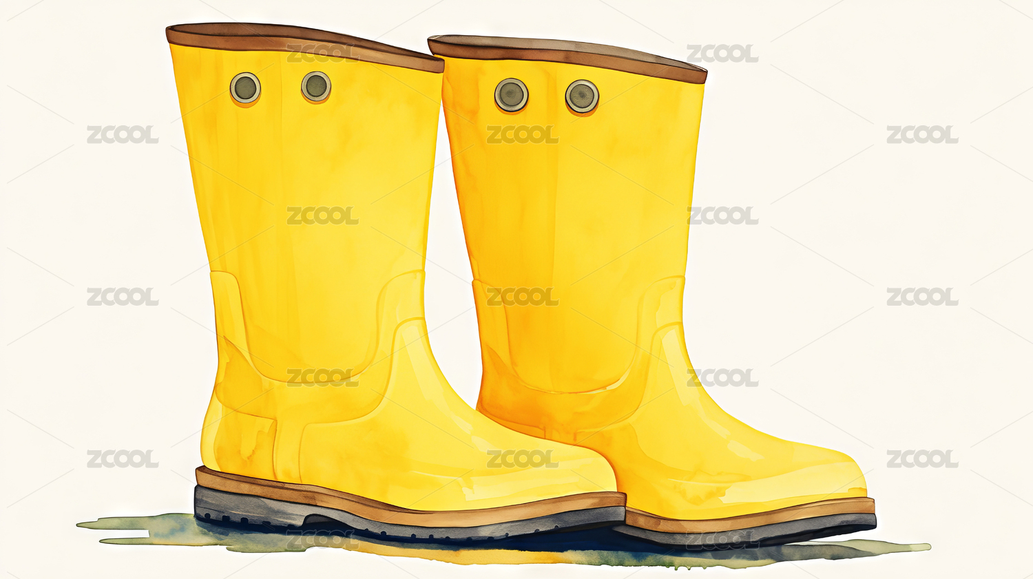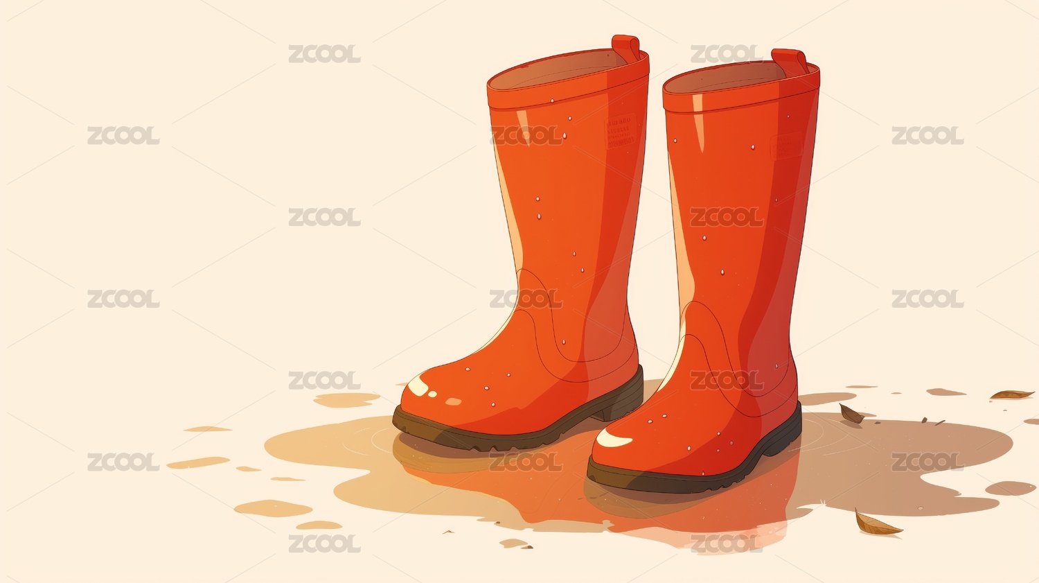 清新明亮水渍的地面一双高腰雨鞋插画绘画