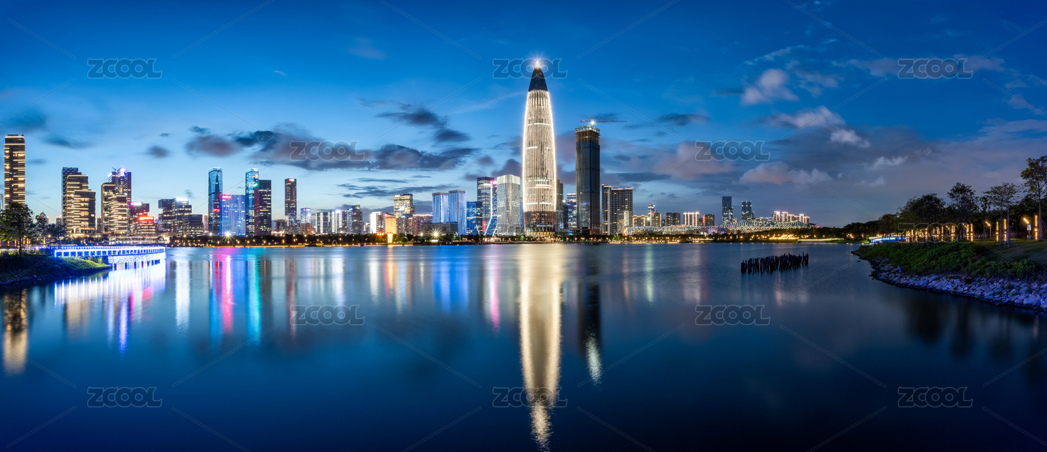 中国深圳市夏天日落时的城市风光与春笋大厦