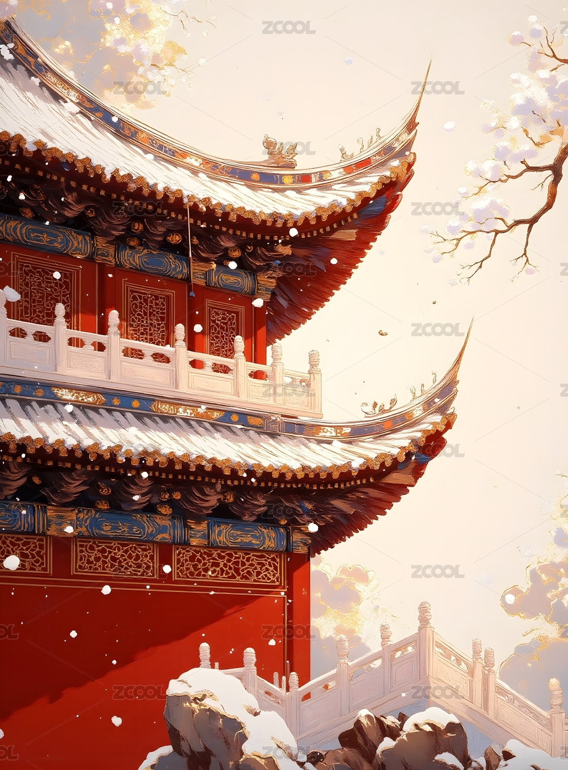中国风雪花建筑风景插画