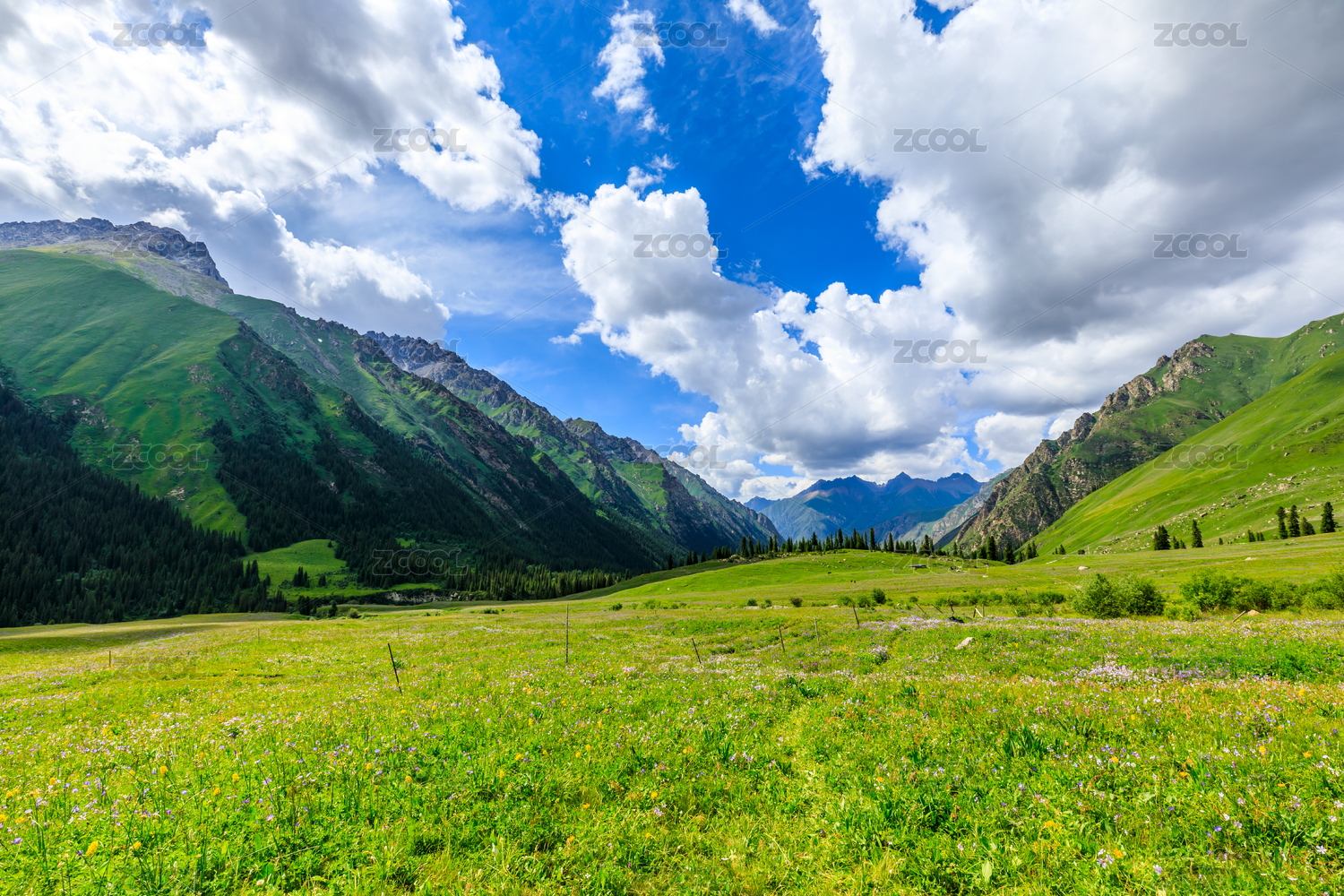 中国新疆下塔风景区雄伟的山脉和绿色的草原
