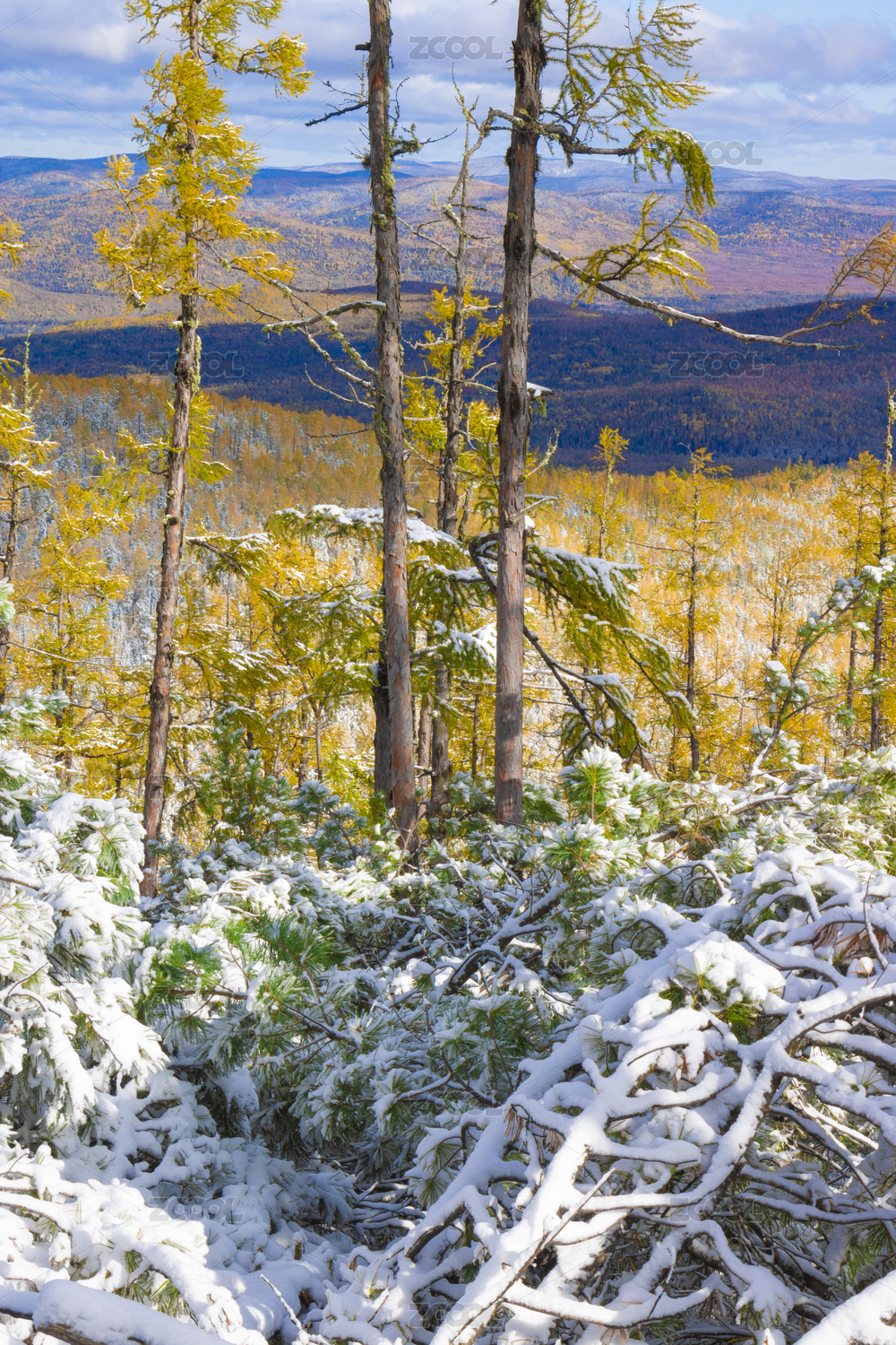 中国大兴安岭秋天金色的兴安落叶松和雪